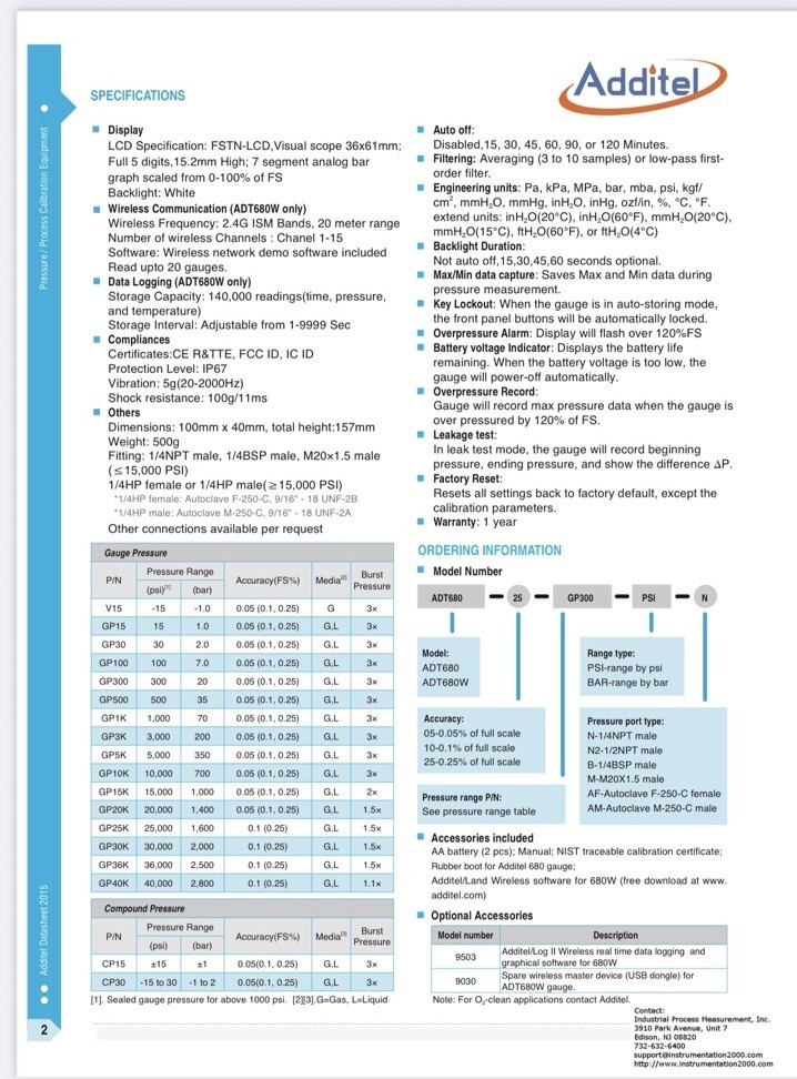 ADDITEL 680 GP 10000 PSI Digital Pressure Gauge BR New Open Box