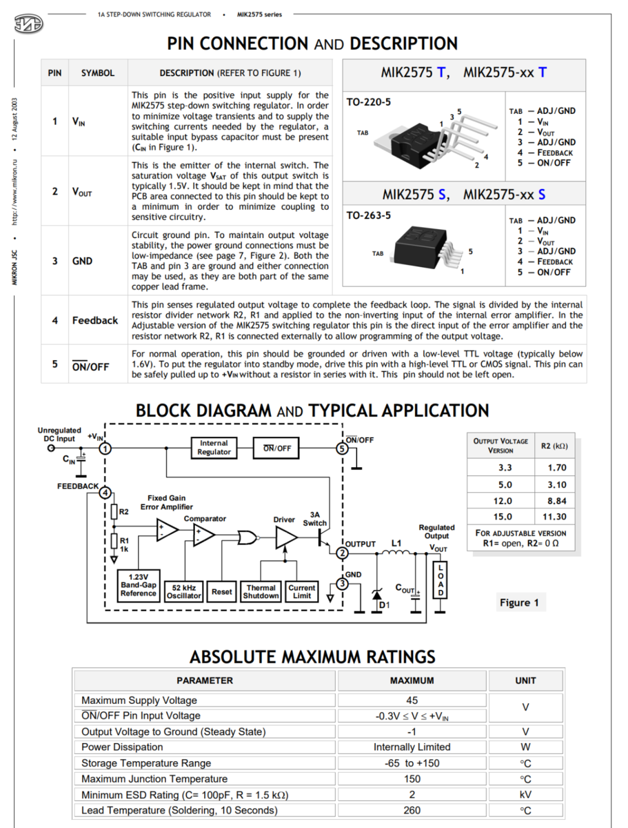 3PCS MIK2575-5.0 Mikron 5V 1A Step Down Switch Mode Regulator 52kHz TO-220-5