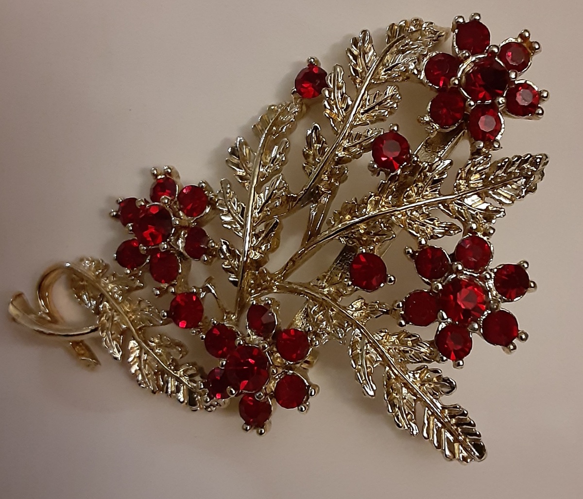 Stunning vintage brooch of textured goldtone leaves adorned with cranberry rhinestone flowers. The camera cannot capture its true color. The piece has a copyright mark, but is an unsigned Coro. Vintage 50s/60s. This very elegant brooch measures 2-3/8" by 1-3/4" and fastens with a 1-1/4" pin bar with working rollover clasp. In excellent vintage condition.