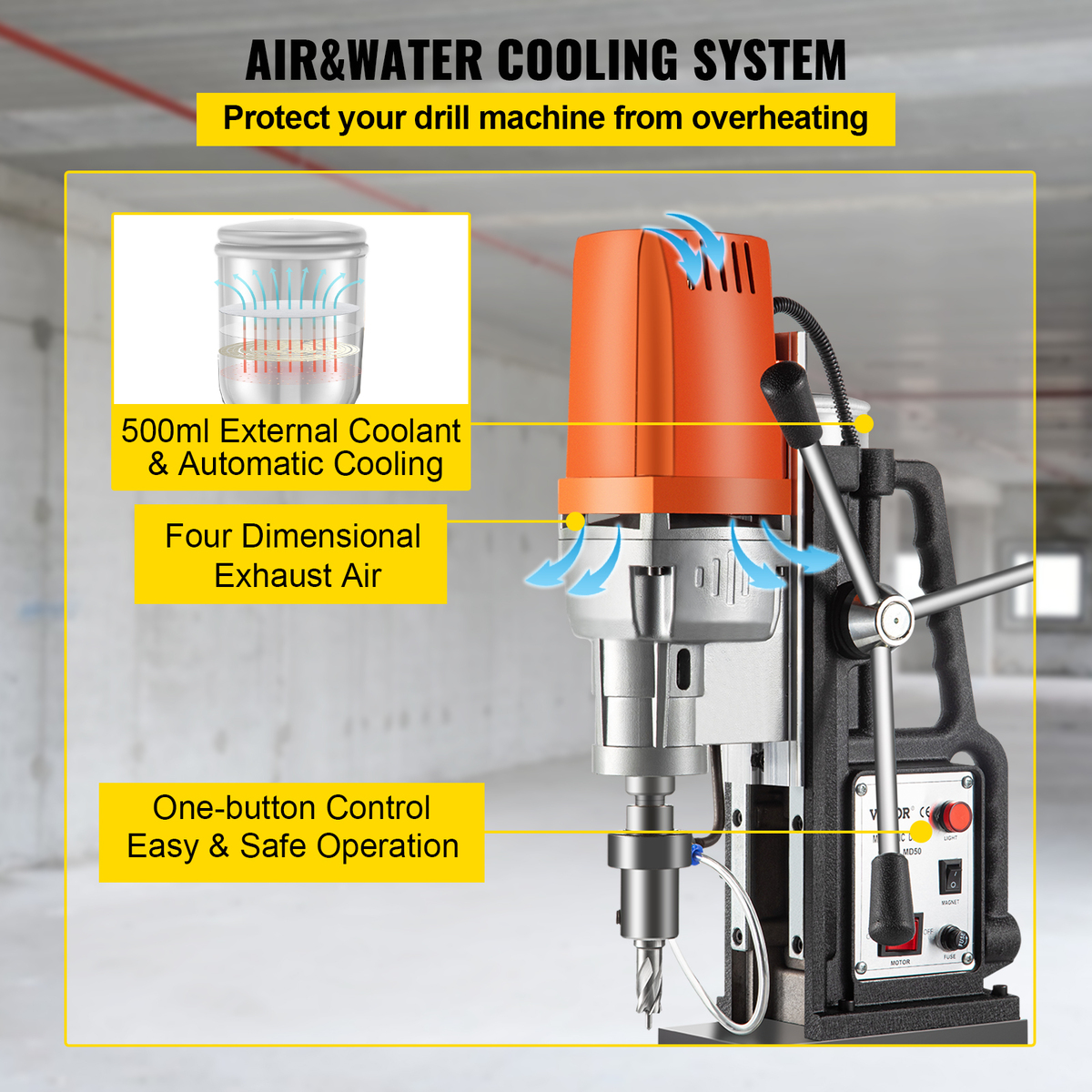 Thoughtful Designs Cooling System: This ergonomic design handle provides comfortable grip in operation and transport. These 3 extended crank handles are coated with nonslip rubber for laborsaving operation. Coolant tank, dustproof air inlet, and exhaust air holes are designed for cooling the magnetic drill press during overheating.