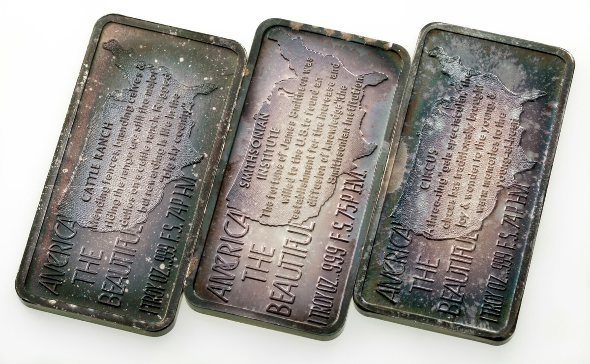 1974-75 Hamilton Mint America The Beautiful 1Oz Silver Art Bars Lotto Di 3 Bars