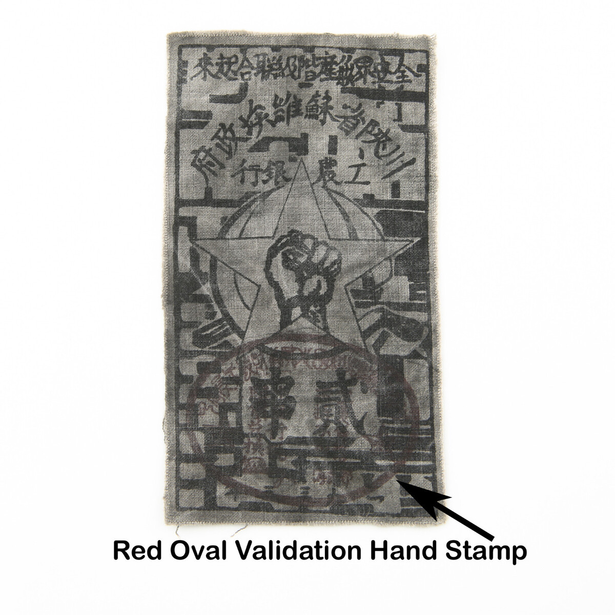 Stampato con inchiostro nero, include timbro a mano di convalida ovale rosso