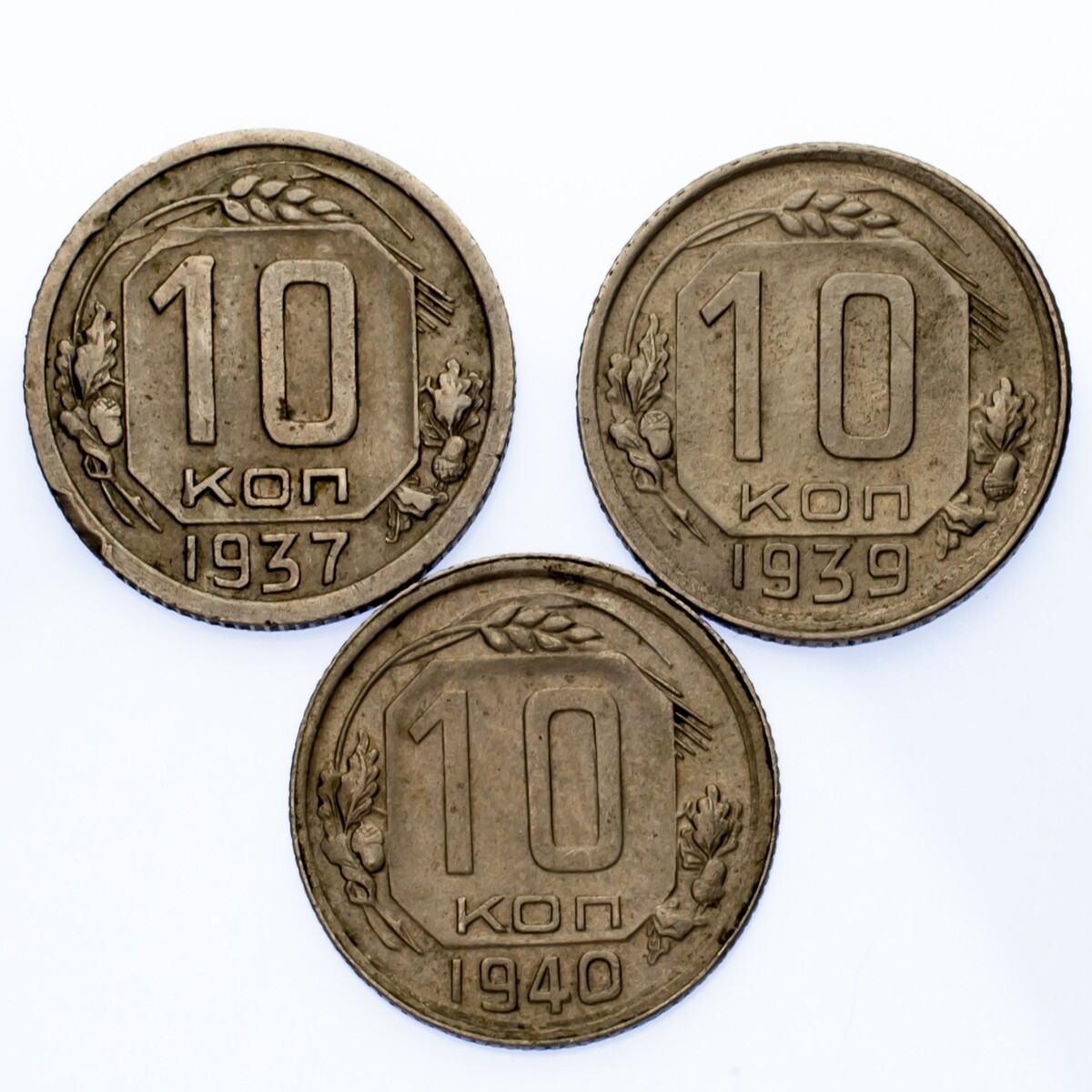 1937, 1939 1940 Russia 10 Kopeks (Extra Fine, XF Condition) 3 Coin Lot