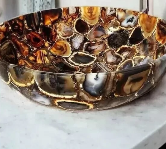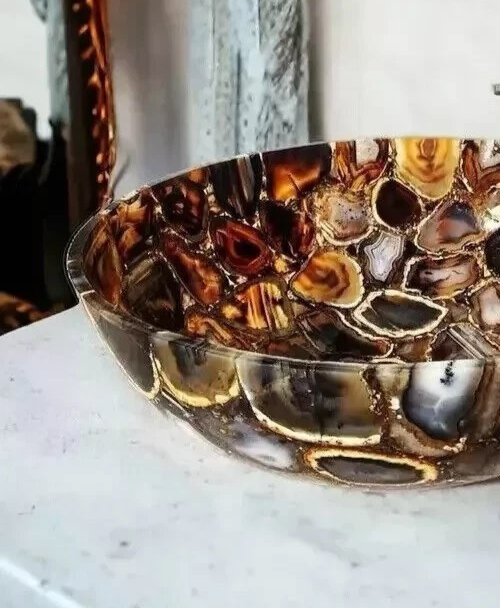 15" Round Natural Agate Stone Washbasin Handcrafted Gemstone Countertop Sink
