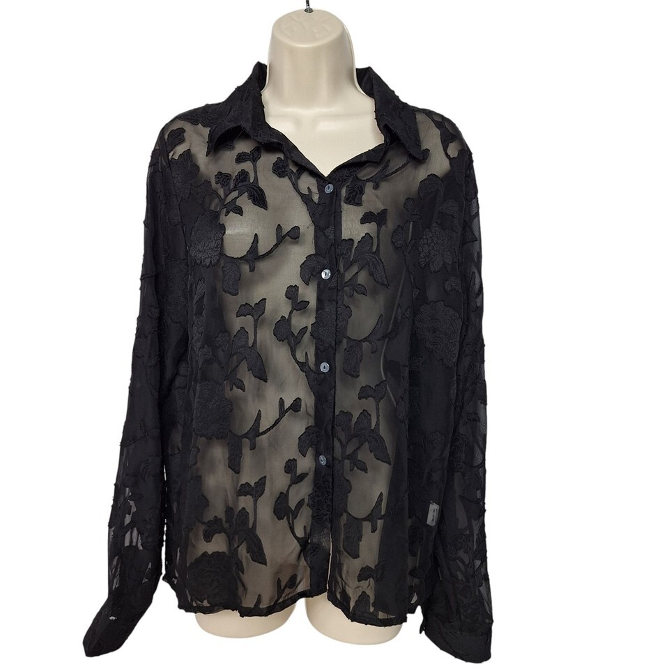 Jon Anna Black Sheer Floral Burnout Blouse Large Long Sleeve Button-Up Shirt