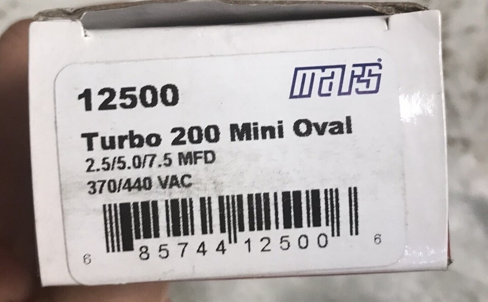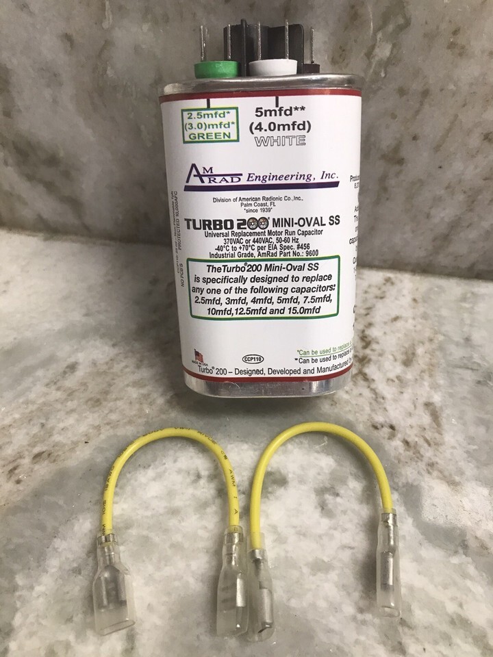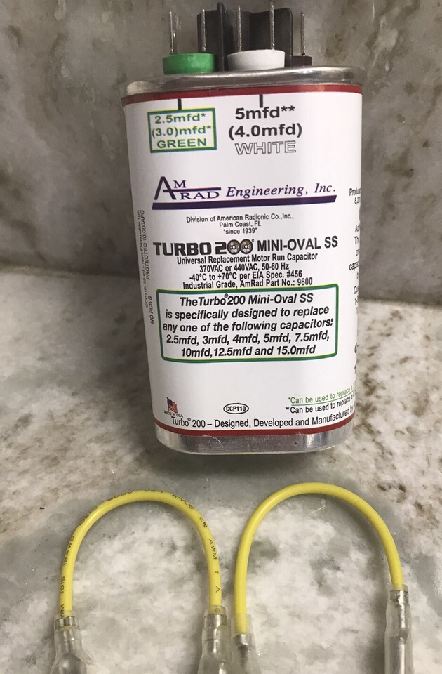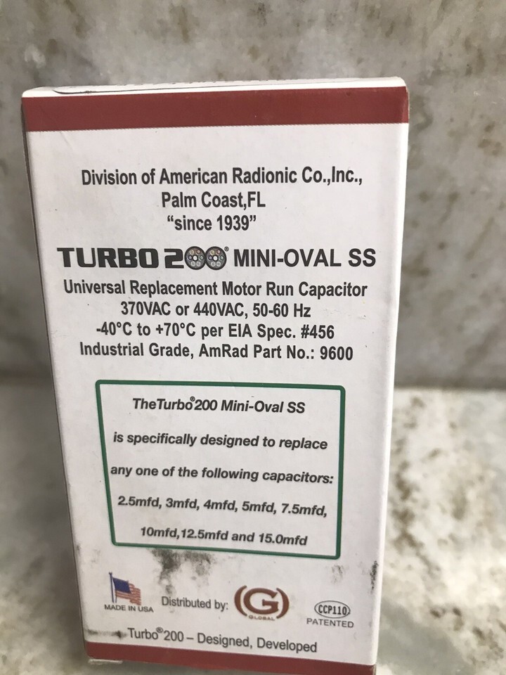 This high-quality running capacitor is perfect for all your HVAC and refrigeration needs. With a universal design and a range of 2.5/5.0/7.5 Mfd, 12500. it's sure to be the perfect fit for your system. The Turbo 200 Mini-Oval model, manufactured by Amrad, is a reliable and durable choice for any professional or DIY project.