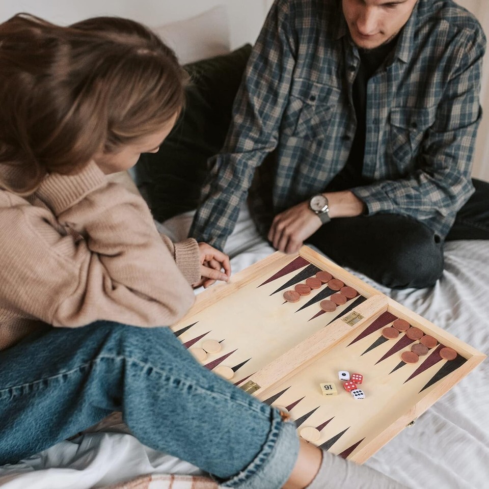 ?COMPLETE SET, GREAT GIFT IDEA?Includes 32 chessmen, 30 backgammon/checker pieces, 2 pairs of dice, and a doubling cube - everything you need to play! This chess board set integrates chess, backgammon and checkers, which greatly improves the playability of the game. Our set is perfect for kids and adults alike, and makes a great gift for birthdays, holidays, or any occasion.