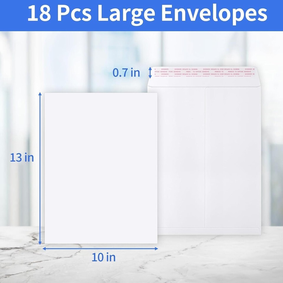 ?18PCS 1013 White Envelopes?You will receive 18PCS mailing envelopes, sufficient quantity can meet your using and replacing needs. The size of the manila envelopes is 1013 inches, suitable for mailing important papers, business documents, booklets, catalogs, brochures or storing magazines, books and more