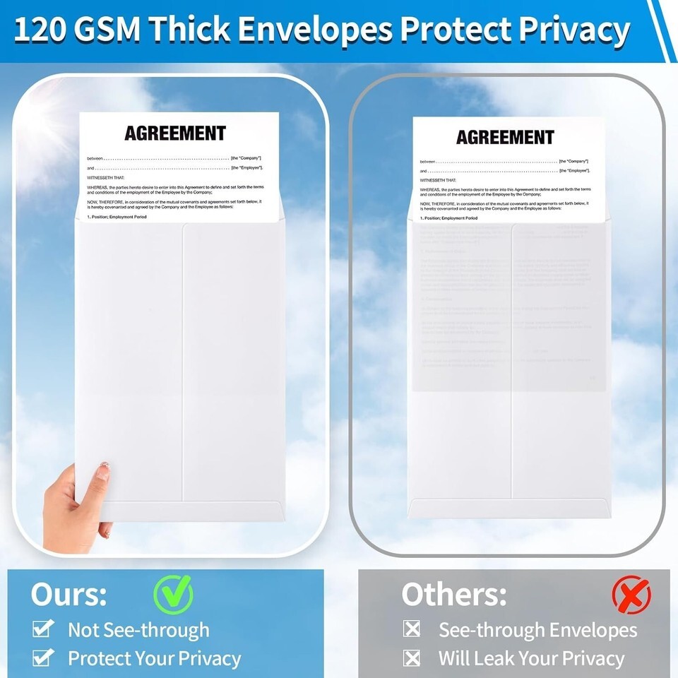 ?Thick and Sturdy?The white manila envelopes are made of 100GSM double adhesive paper, which has excellent rip, tear and puncture resistance, catalog envelopes strong, thick and opaque. Perfect for obscuring sensitive information and protecting critical documents. Ideal for for secure business mailing