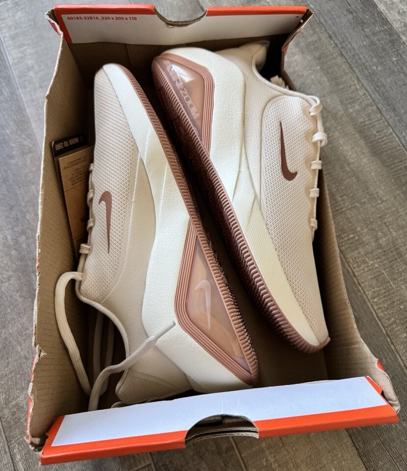 The product is a pair of Nike Bella 7 Women's sneakers in size 8.5. They feature a pearl white, soft pearl, and rose gold color scheme with a mesh upper material. The sneakers belong to the Nike Zoom Bella product line and were released in 2025. With a stylish design and athletic type, these sneakers are a fashionable and comfortable option for women looking for a versatile shoe.
