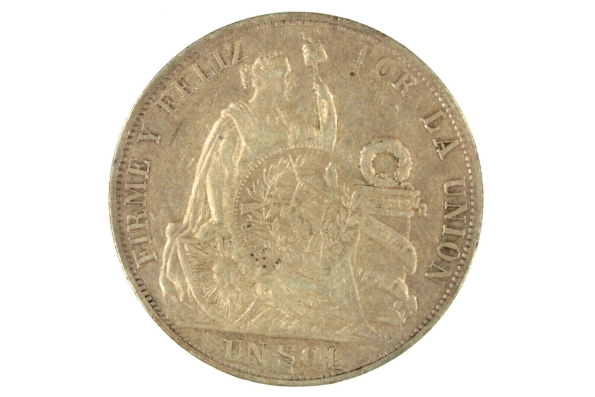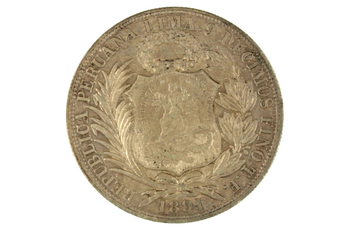 1891 Perú Un Sol con un contrasello de Guatemala de 1894 de 1/2 Real