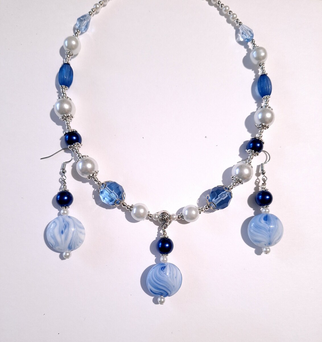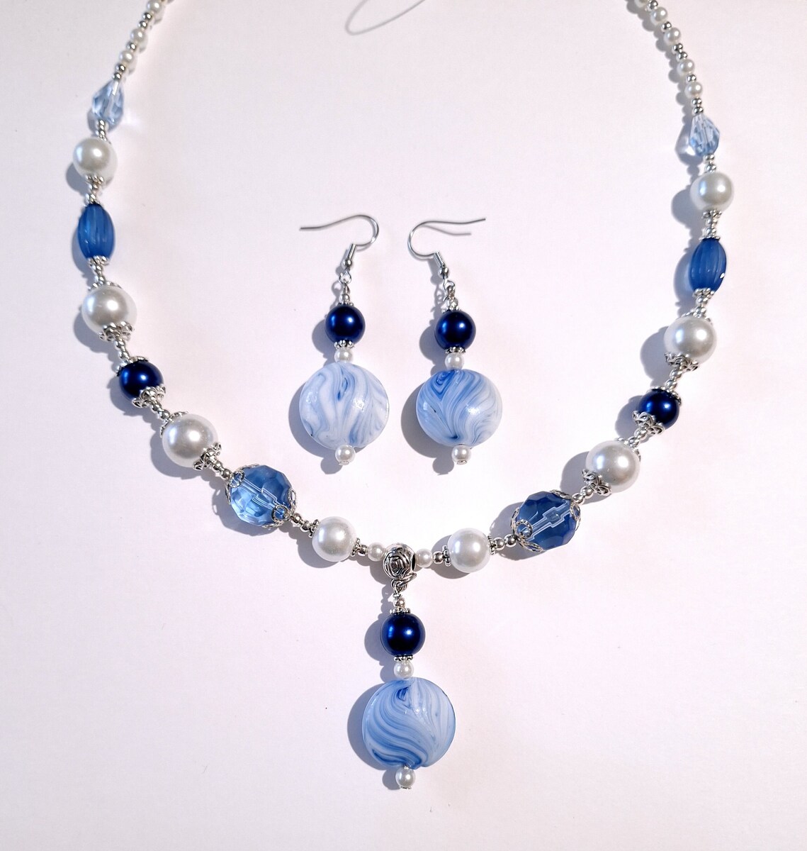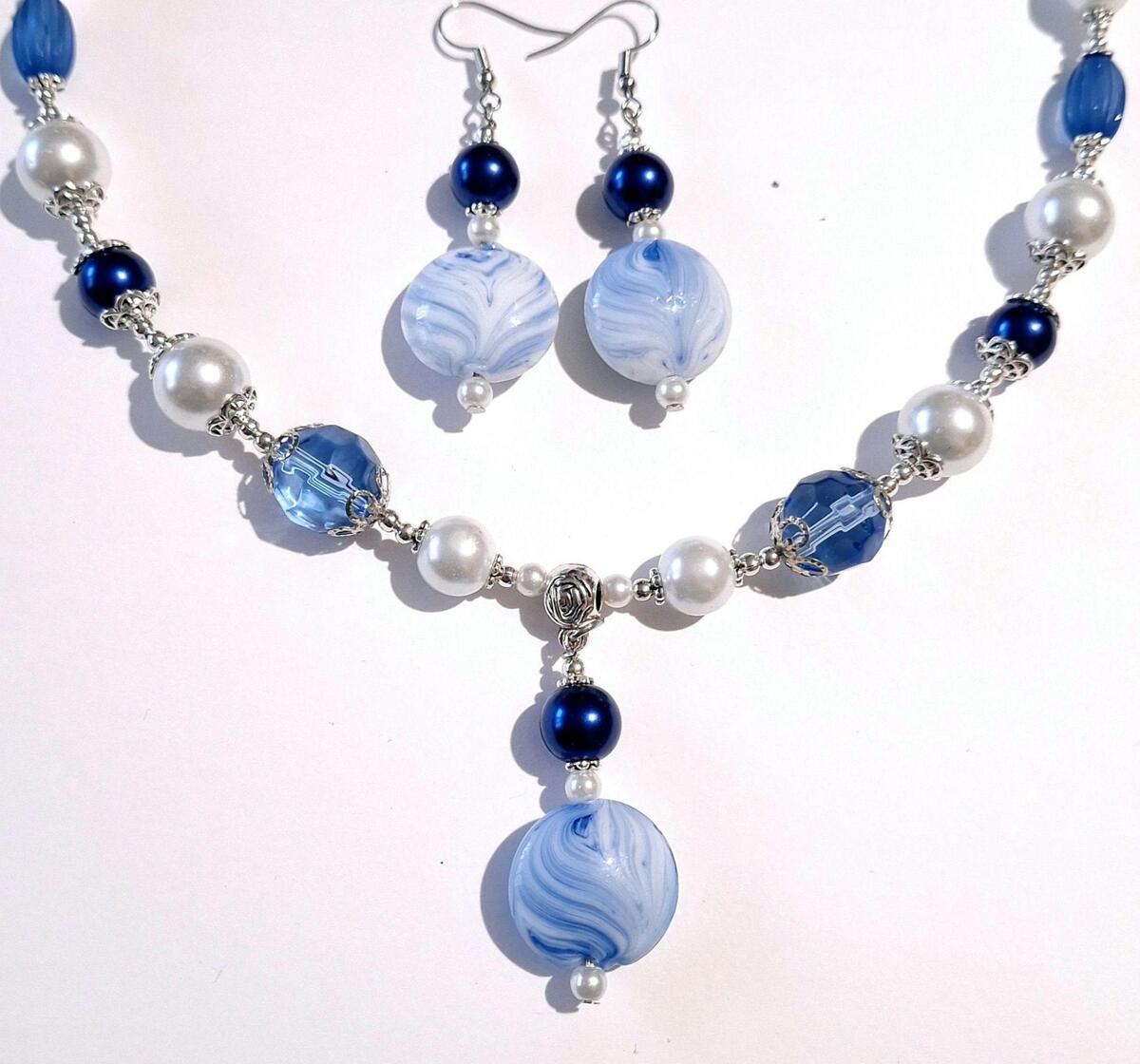 Bohemian set silver-tone set Handmade Murano blue-white glass beads set earrings and necklace . Bohemian Cobalt blue glass pearl and white glass pearls and blue teardrop crystals and faceted large glass blue beads jewelry set .