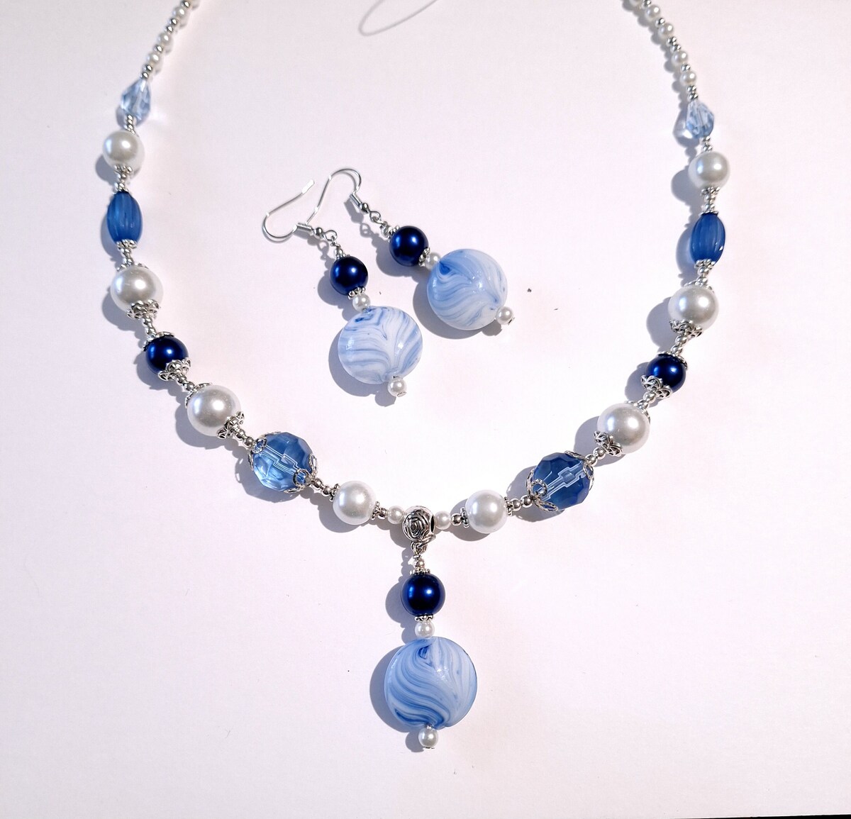 Materials : handmade glass beads , cobalt blue glass pearls, white glass pearls, blue faceted teardrop Crystals, blue faceted glass beads, silver-tone beads.