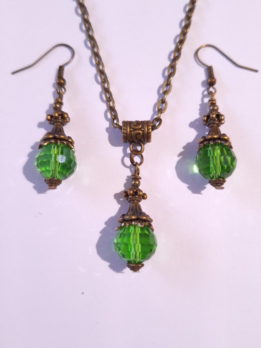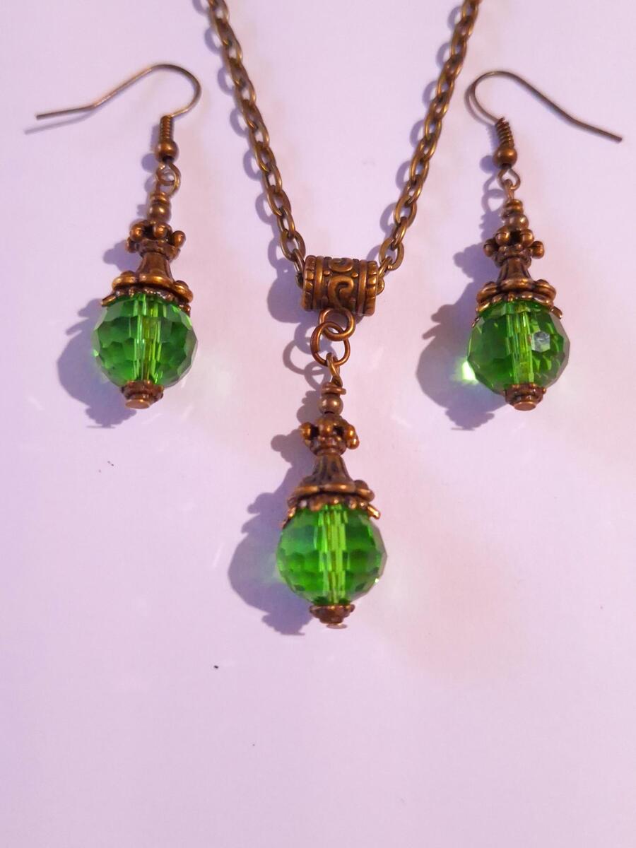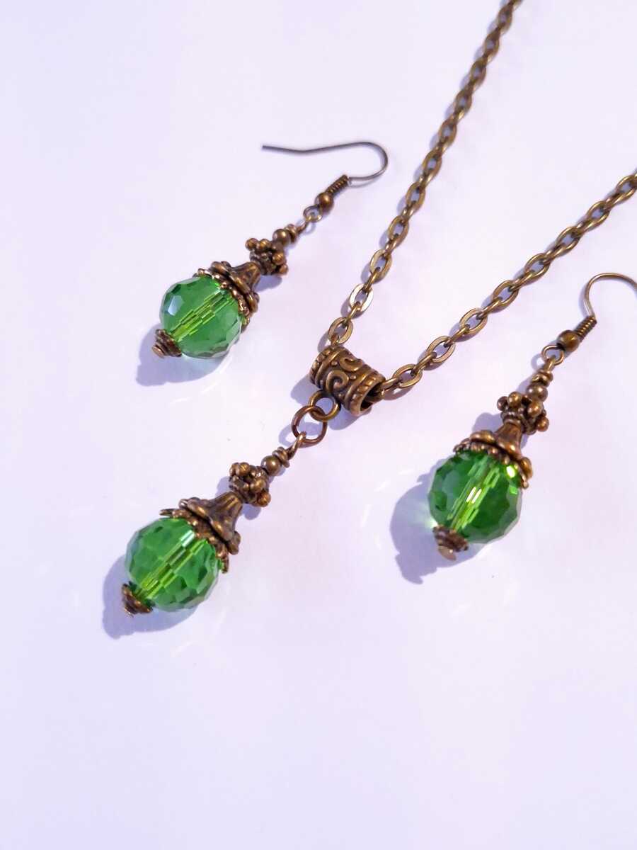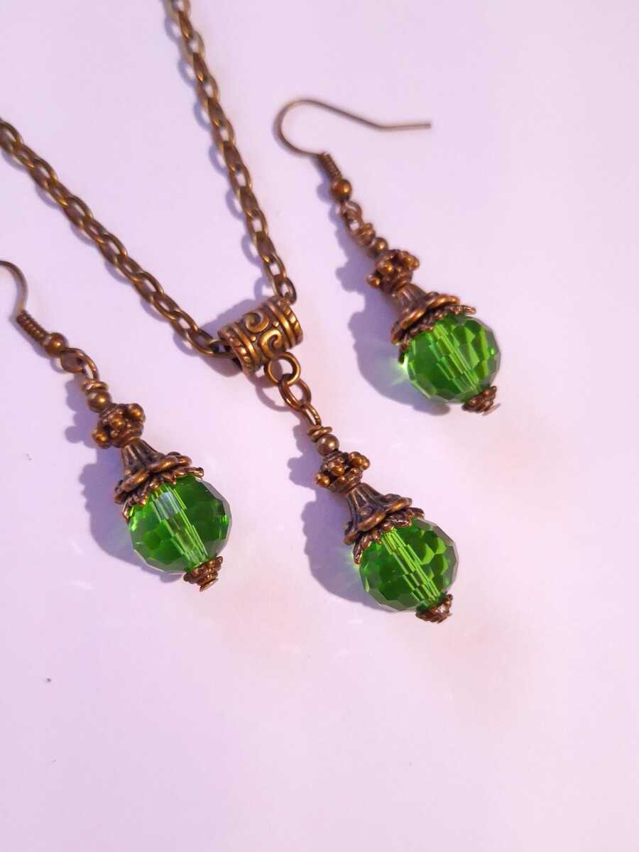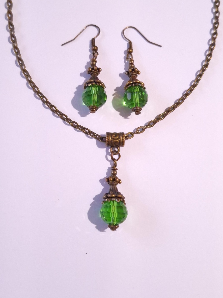 Beautiful Set of bronze Antique style Emerald green crystal beads necklace and earrings. Antique bronze tone pendant Victorian style necklace and earrings. Boho necklace. Bohemian necklace and earrings. Romantic necklace and earrings. Beautiful necklace with same style earrings with fine emerald green faceted Czech crystals beautiful beads and elegant bronze ornaments .
