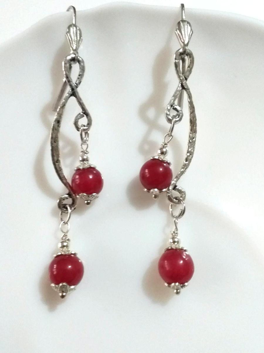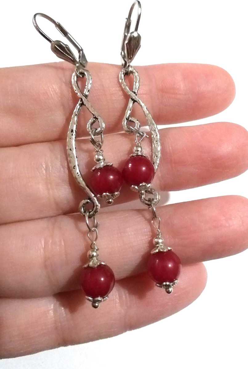 July birthstone, beautiful genuine Ruby necklace and earring set. 8 mm round red ruby gemstone hand set with silver-tone ornamented hammered base pendants. Ruby pendant comes on an 18.20 (46 cm) inch silver-tone chain.