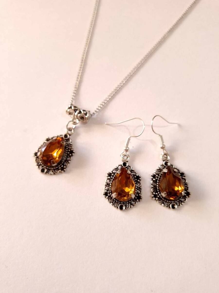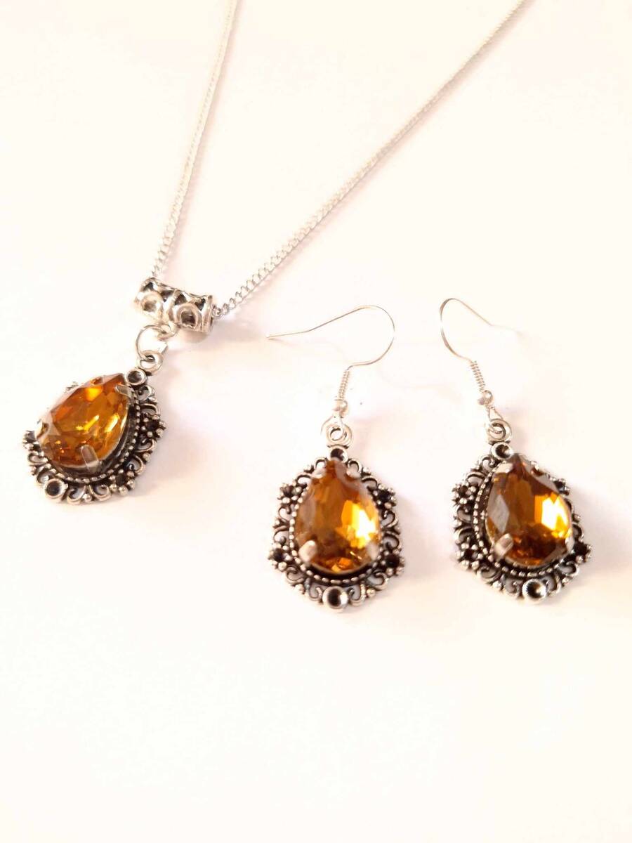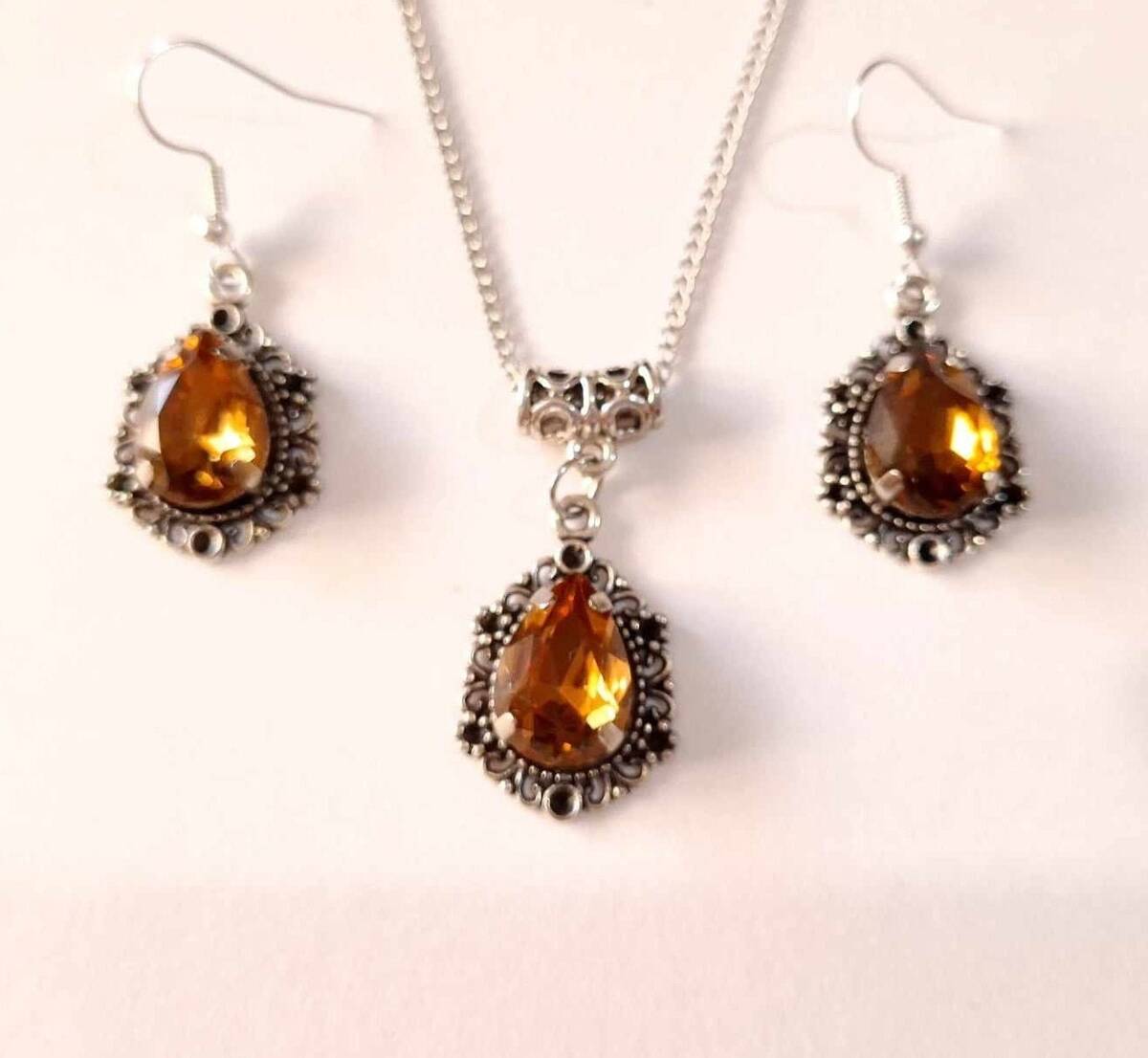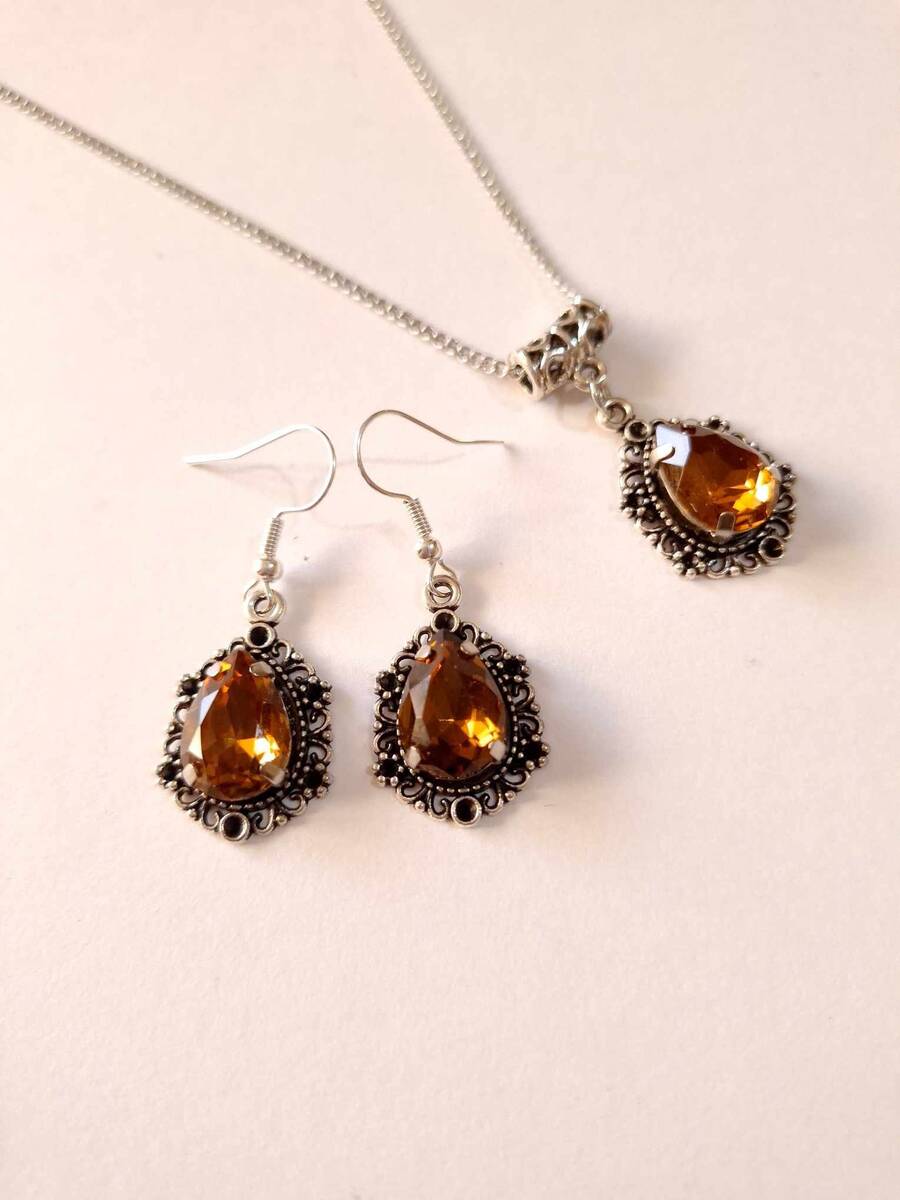 Beautiful Set of silver-tone Antique style beads cognac brown faceted teardrop shaped glass cabochon necklace and earrings. Silver tone pendant Victorian style necklace and earrings. Boho necklace. Bohemian necklace and earrings. Romantic necklace and earrings.