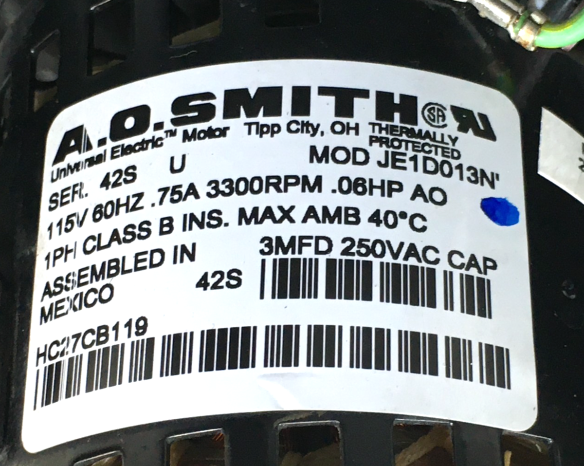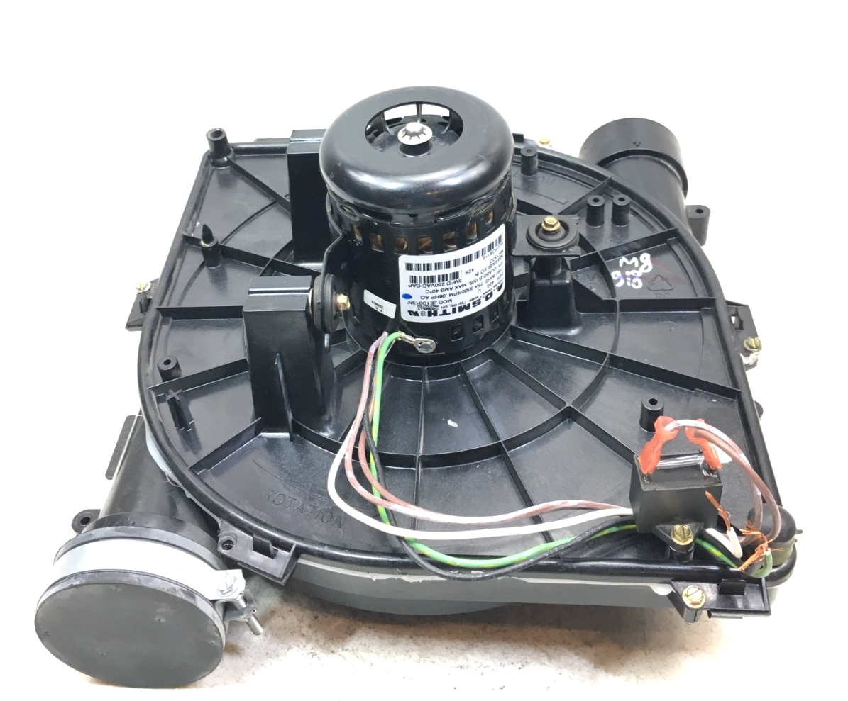 This is A.O.SMITH JE1D013N Carrier Bryant Draft Inducer Blower HC27CB119 115V 3300 RPM used part.