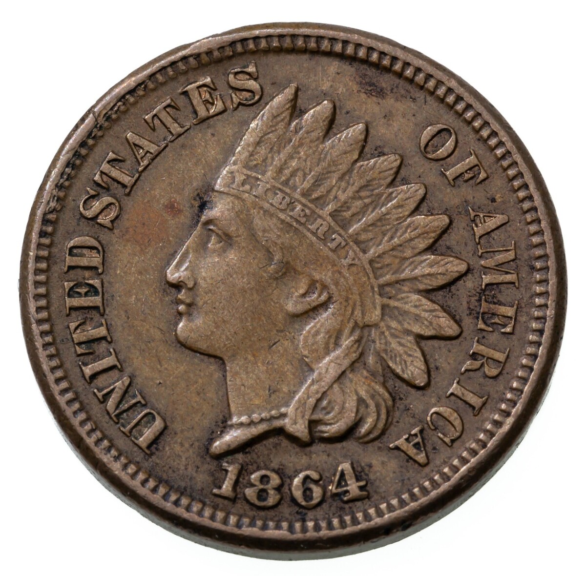 1864 CN Indian Cent Extra Fine XF Condition, Brown Color, 4 Diamonds, Full Beads