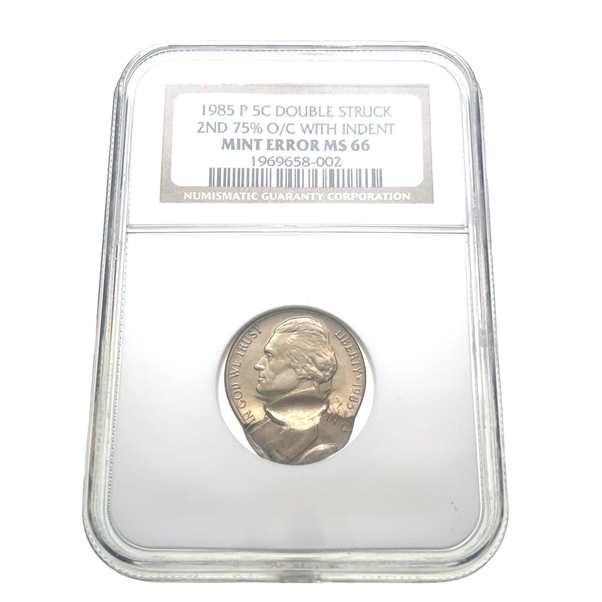 1985-P 5C Jefferson Nickel Doble golpeado 2do 75% O/ C con Error de sangría NGC MS66