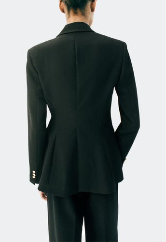 Long black sleeve blazer with a lapel collar and shoulder pads. Featuring a buckle and knot detail with front pleats. Concealed front snap-button fastening.