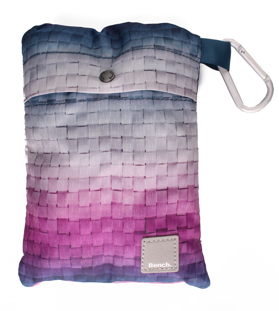 This is for a brand new with tags Bench Womens Orion Blue Light Weight Brukner B Packable Backpack Classic backpack with a colorful basket weave print. Two way zipper opens up to the main compartment with a small compartment with a carabineer. Front zippered pouch with a logo tab offers more storage. Nylon adjustable straps at the back. Entire bag packs into inner pocket for a portable storage solution. Sponge clean only. Do not bleach. Do not tumble dry. Do not iron. Do not dry clean.