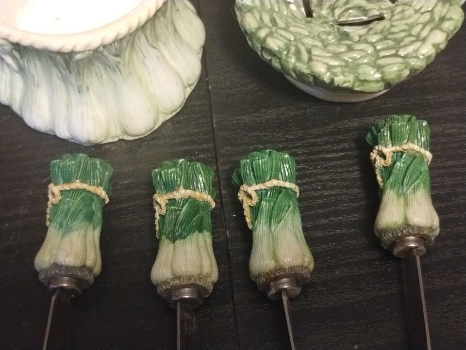 Add a touch of vintage charm to your kitchen with this rare set of 4 vegetable spreaders from Jay Import. The spreaders come with a convenient holder bowl for easy access and storage. Made for those who appreciate quality and style, these spreaders are perfect for serving up your favorite dips and spreads. The set is in excellent condition and ready to be used and enjoyed.