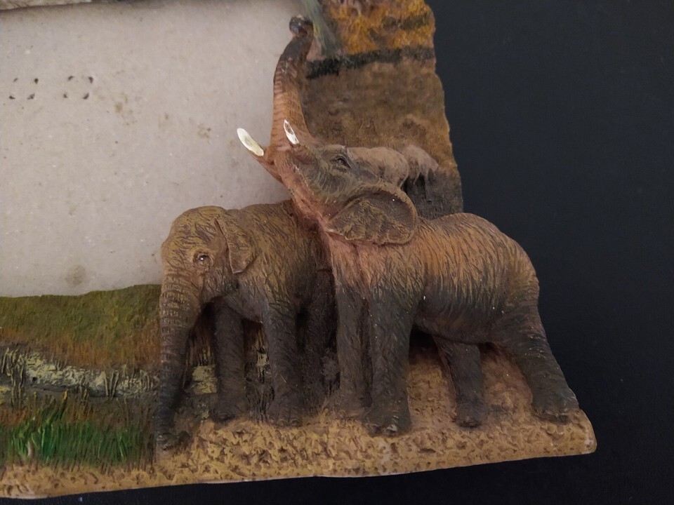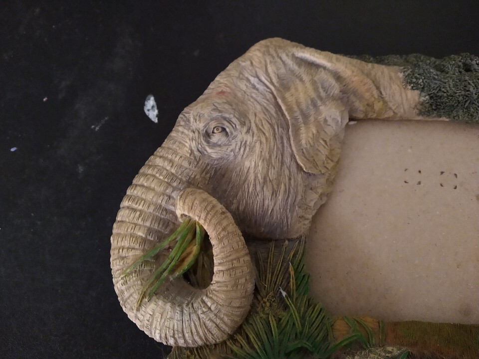 Showcase your treasured memories in this stunning Wong's Elephant 3D Picture Frame from 2002. The Animal Print Pattern and Nature Theme add an exotic touch to your home decor. The Rectangle shape and suitable 4 x 6 in Photo Size of this Resin Material Photo Frame make it a perfect fit for any table or shelf. You can fill this Photo Capacity Frame with your favorite picture of your loved ones and it will surely be a conversation starter. The Model of the Elephant is intricately crafted and is a rare find. The dimensions of the frame can be easily determined by checking the pictures.