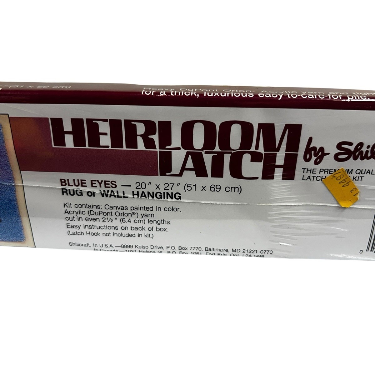Vintage Shillcraft Heirloom Latch hook kit ?Blue Eyes? No. 1414. Features a Siamese cat design for a 20? x 27? (51 x 69 cm) rug or wall hanging. Kit includes pre-cut acrylic DuPont Orlon yarn, printed canvas, and easy instructions. Still factory sealed in original packaging with some shelf wear to plastic wrap. A nostalgic craft kit for collectors or anyone who loves DIY needlework, latch hook, or cat-themed decor. Made in the USA.
