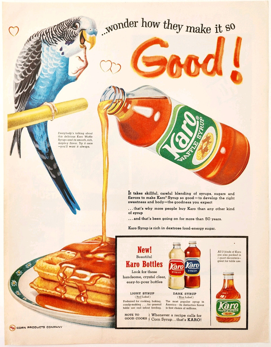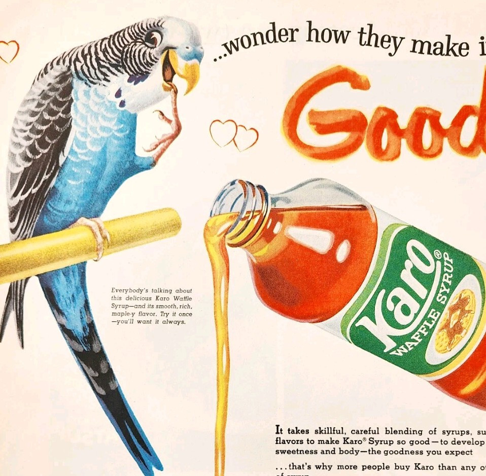 1959 Karo Waffle Syrup Budgie Bird Advertisement Breakfast Condiments DWII27