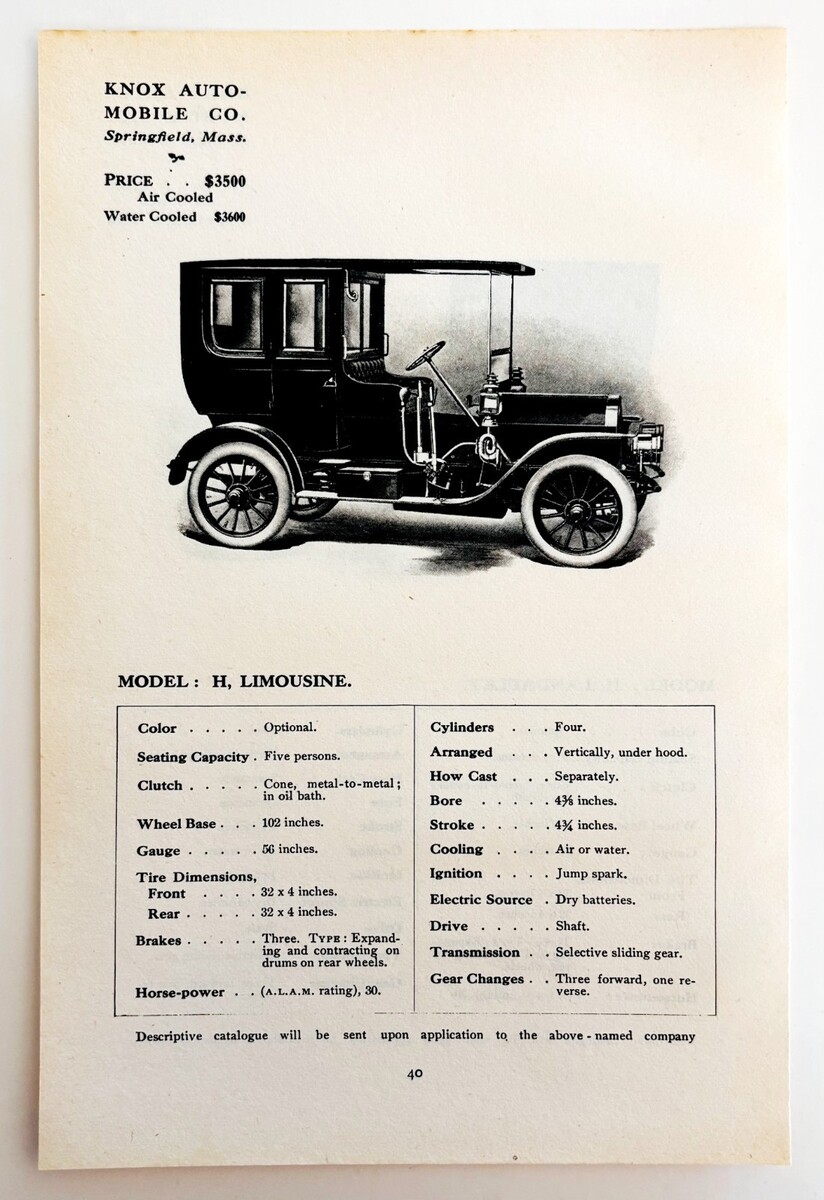 1908 Knox Auto Model H Limousine Print Catalog Advertisement Automobilia F14E