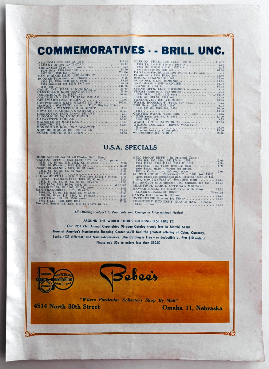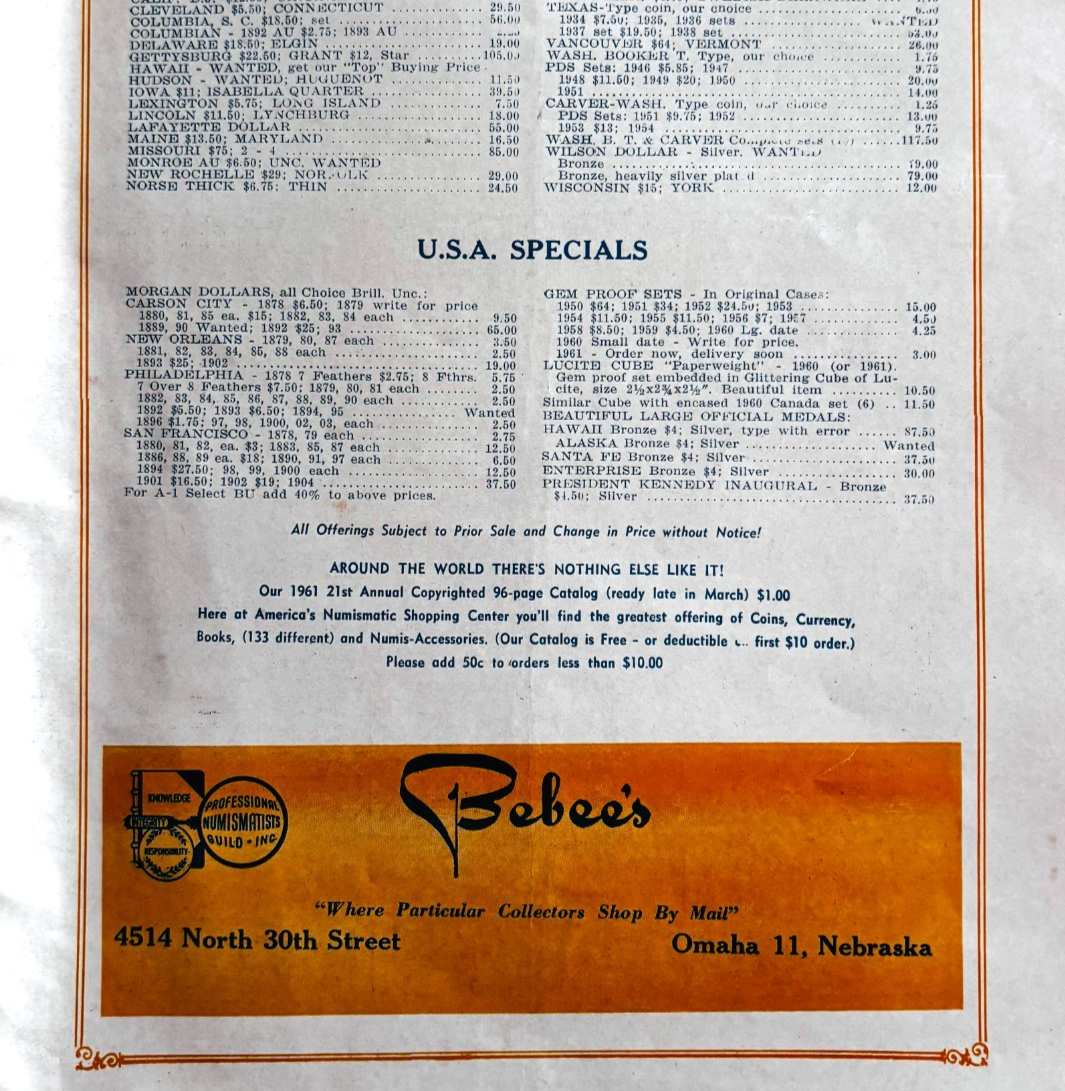 1961 Bebee's Numismatics Shop Advertisement and 48 similar items