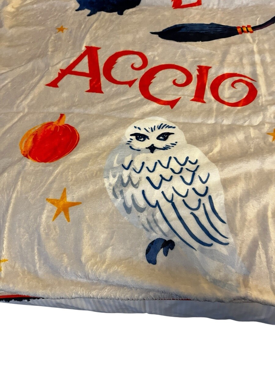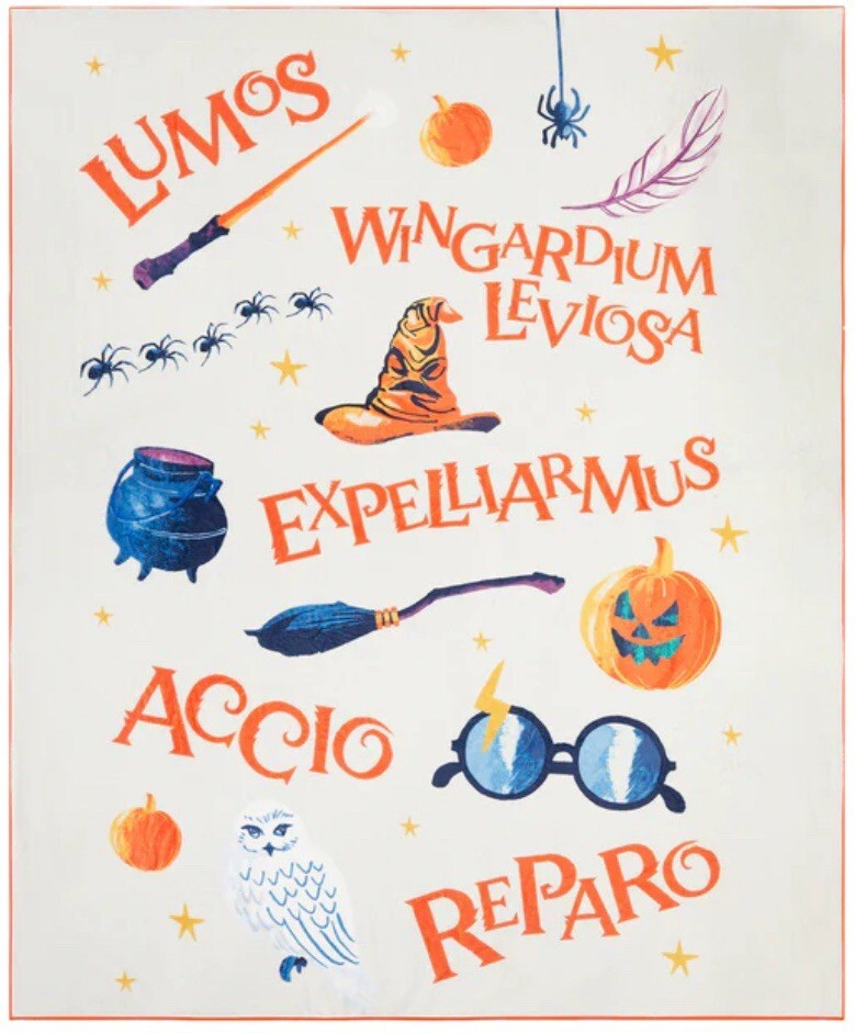 Brand new for Halloween! This officially licensed Harry Potter Lumos Nox Throw Blanket is so soft and warm ? the perfect seasonal collectible for any Wizarding World fan. The cozy plush fabric showcases spells like Lumos, Wingardium Leviosa, Expelliarmus, Accio, and Reparo along with festive pumpkins, Hedwig the owl, Harry?s glasses, lightning bolt, broomstick, Sorting Hat, cauldron, and magical stars. Measuring 50? x 60? (130cm x 150cm), it?s ideal for snuggling on chilly nights, Halloween decor, or gifting to a Potterhead. A magical, velvety blanket for fall comfort and Hogwarts charm!