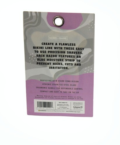 Achieve smooth, precise results with the Nord+Bare Mint 3-Pack Bikini Trim Razors, designed specifically for curves and sensitive skin. Each razor features a soothing aloe moisture strip for added comfort, ensuring a gentle shave even in delicate areas. The ergonomic mint-colored handles provide a secure grip, making precision trimming effortless. Packaged in a stylish and modern card with clear plastic compartments for each razor, this set is both visually appealing and practical for easy storage. Perfect for on-the-go touch-ups or everyday grooming