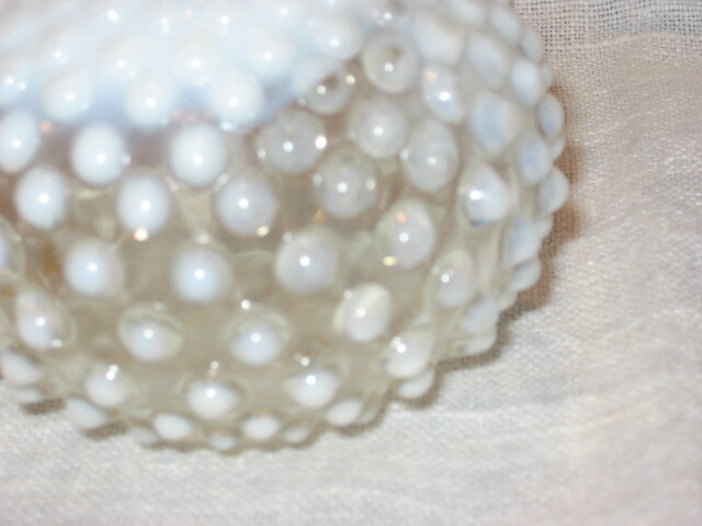 This rare 1940's beauty would bring glamour wherever it sits. Adorn your vanity, dresser or curio shelf. The opalescent finish of the milk glass has been called Moonstone. The white begins saturated at the neck bands and slowly dissolves away into clear hobnail. There is residue remaining inside that easily could be cleaned away. See Photo #3. Original stopper is missing. No flaws. No markings. Fenton did not mark their products until after 1974. Measures 5.25" tall X 1.25" diam opening X 1.5" diam base. Look for other milk glass collectibles in my booth.