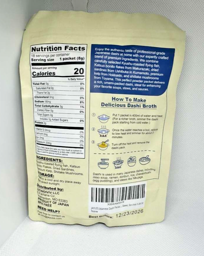 JAYUSS Japanese Dashi Packet, Traditional Dashi Soup Stock 8g×18pacs, No GMO, No