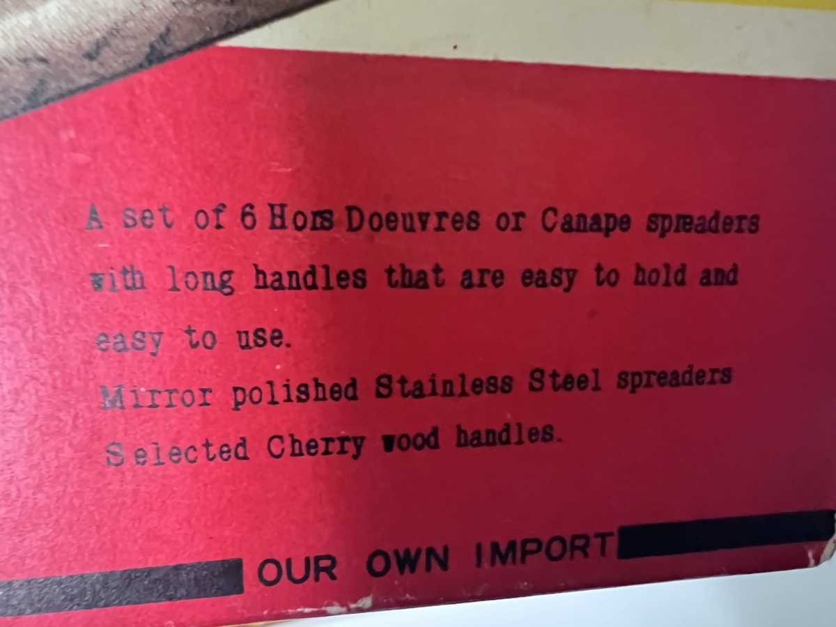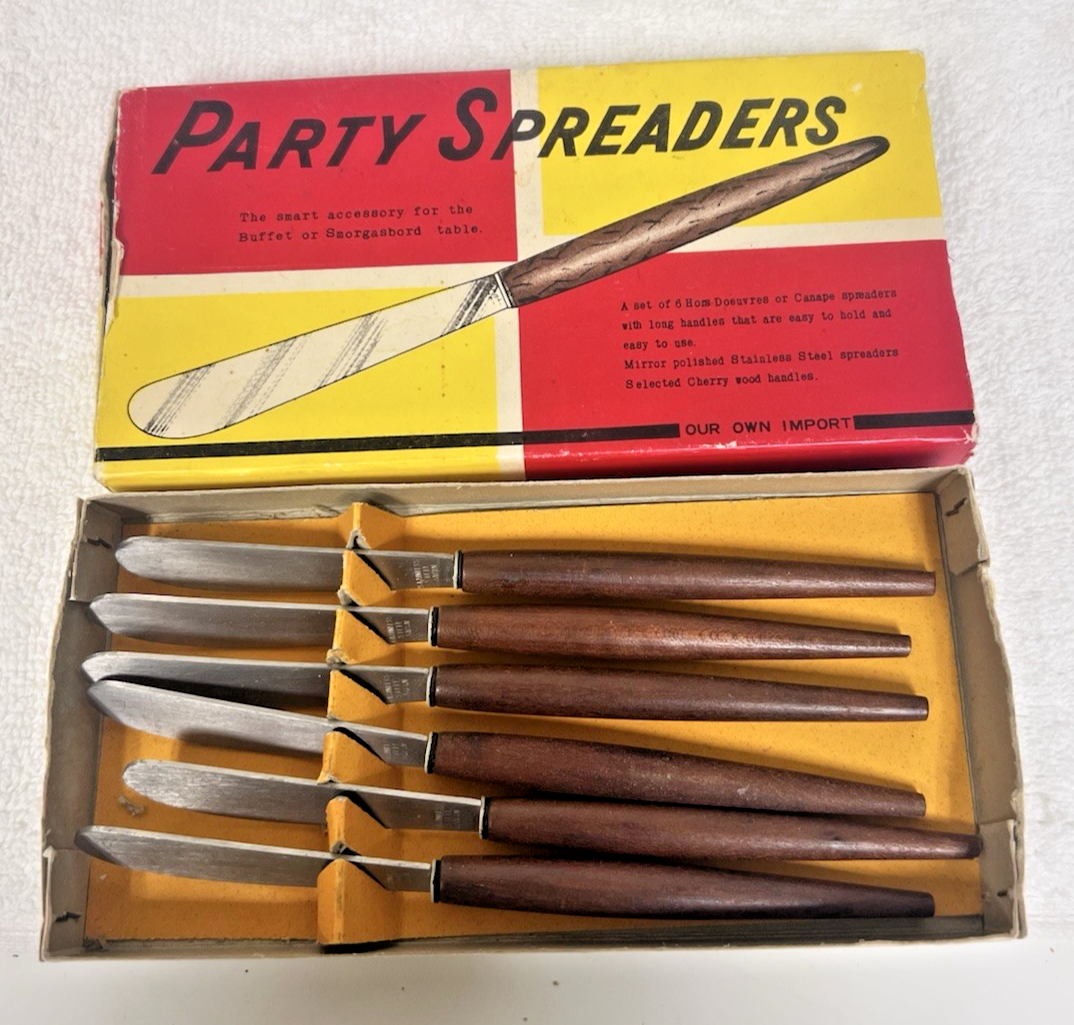 MCM Vintage Stainless w Wood Handle Party Spreader Knife Set in Box 6 inch Long the knives are in great shape however the box is worn the lid is missing one end and the pother is loose
