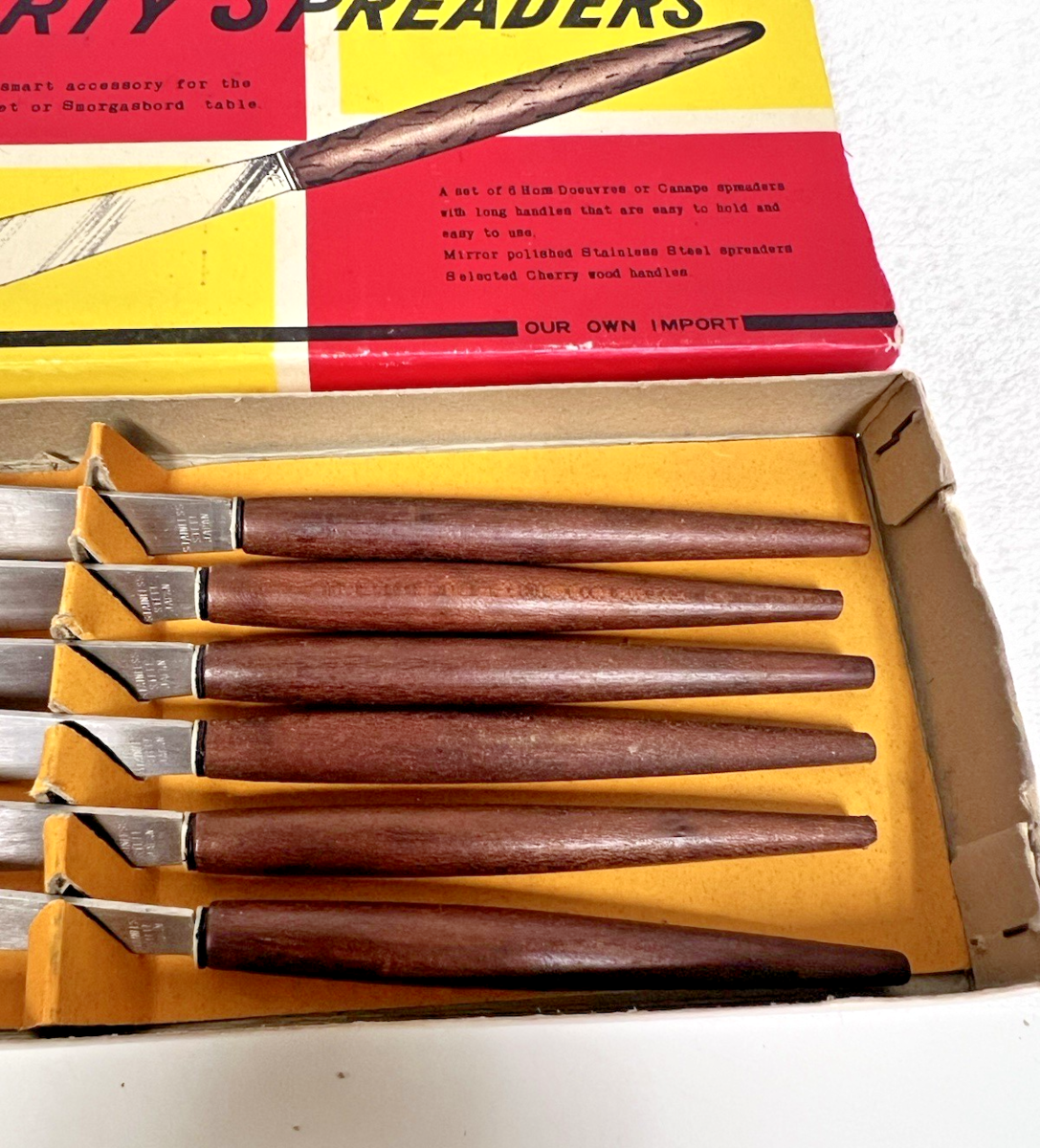 MCM Vintage Stainless w Wood Handle Party Spreader Knife Set in Box 6 inch Long