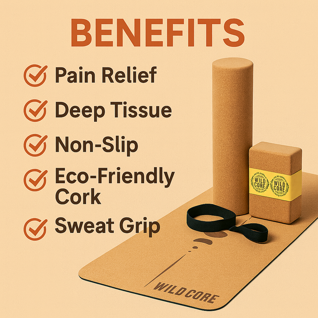 Wild Core 3-Piece Cork Yoga Set – Premium Mat + Roller + Block (Eco-Friendly Performance)