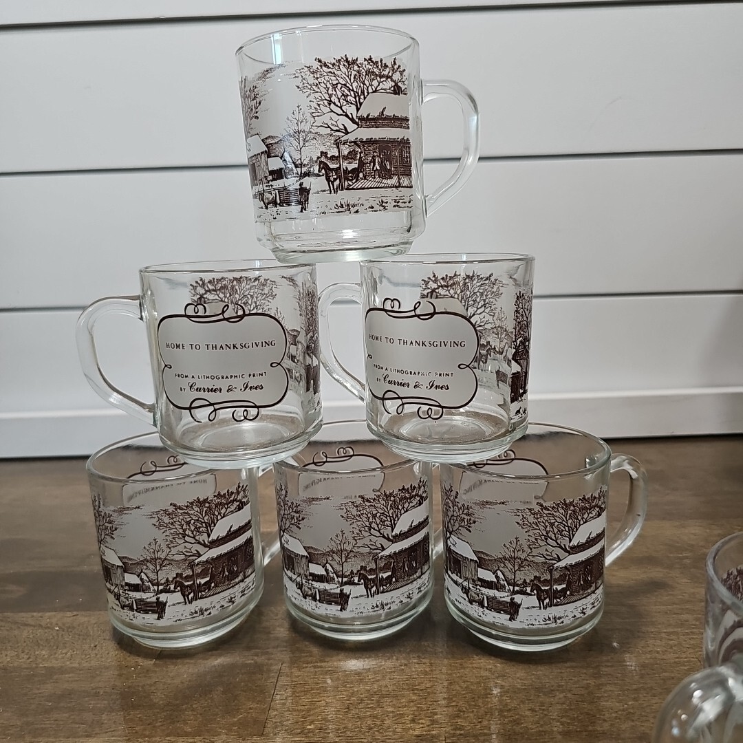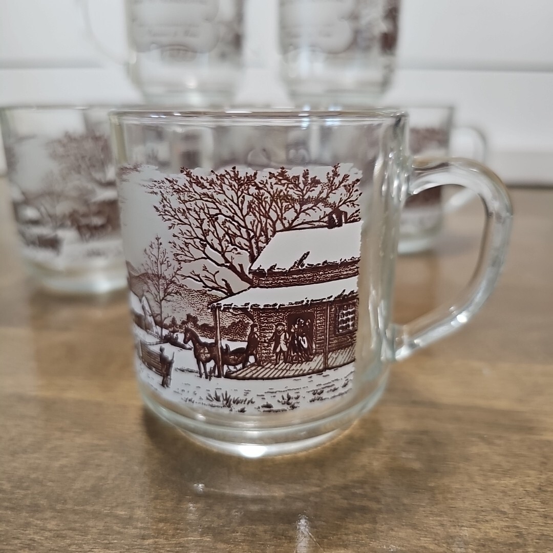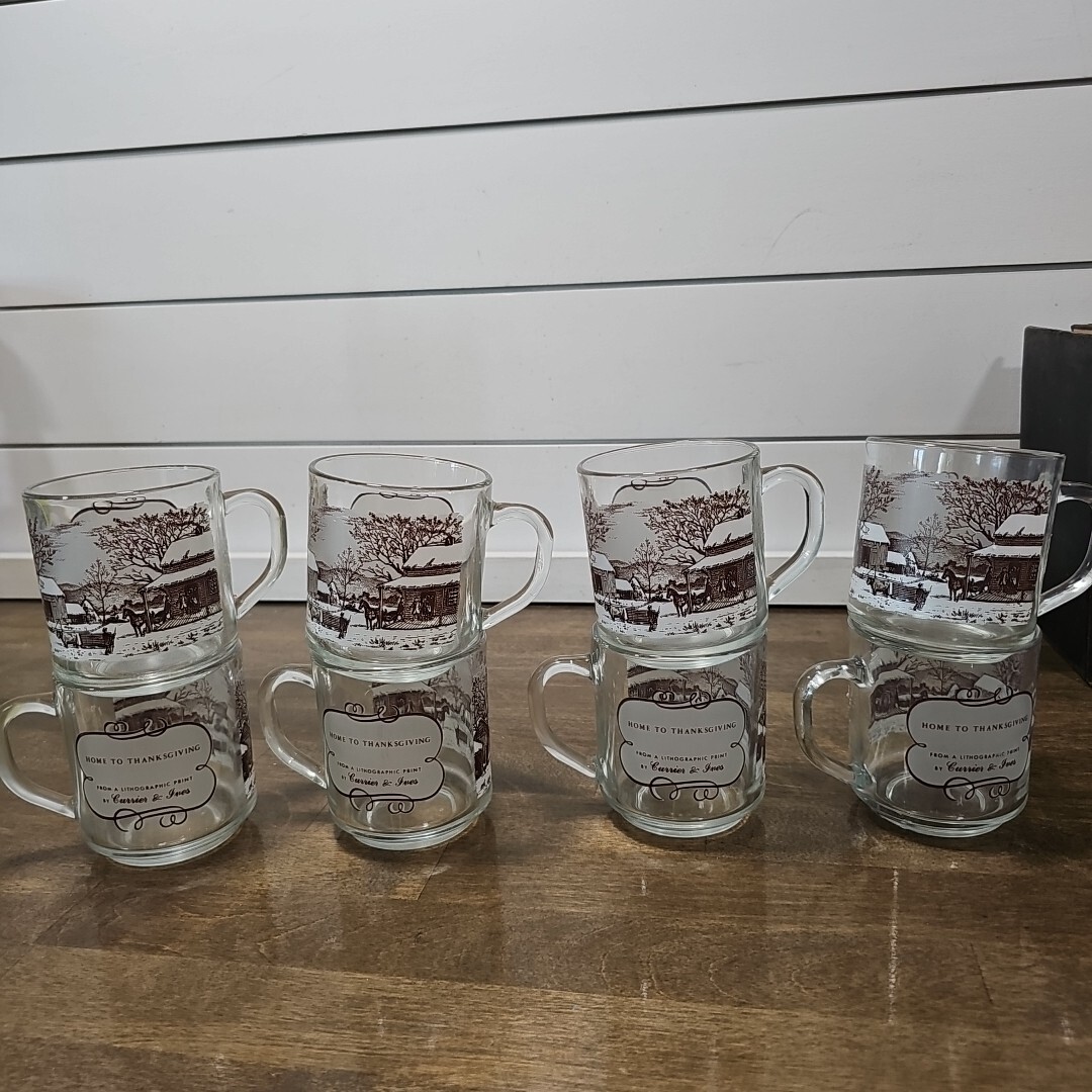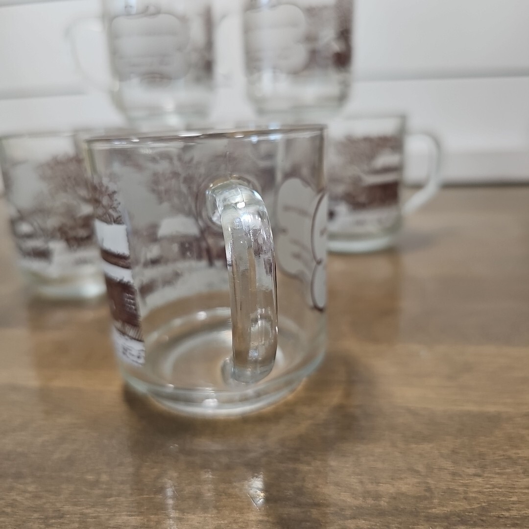 Vintage Set of 8 Currier & Ives Winter Homestead Luminarc Glass Handled Mugs