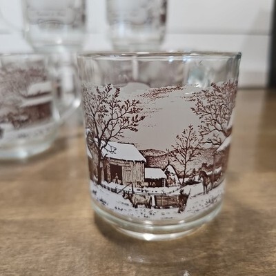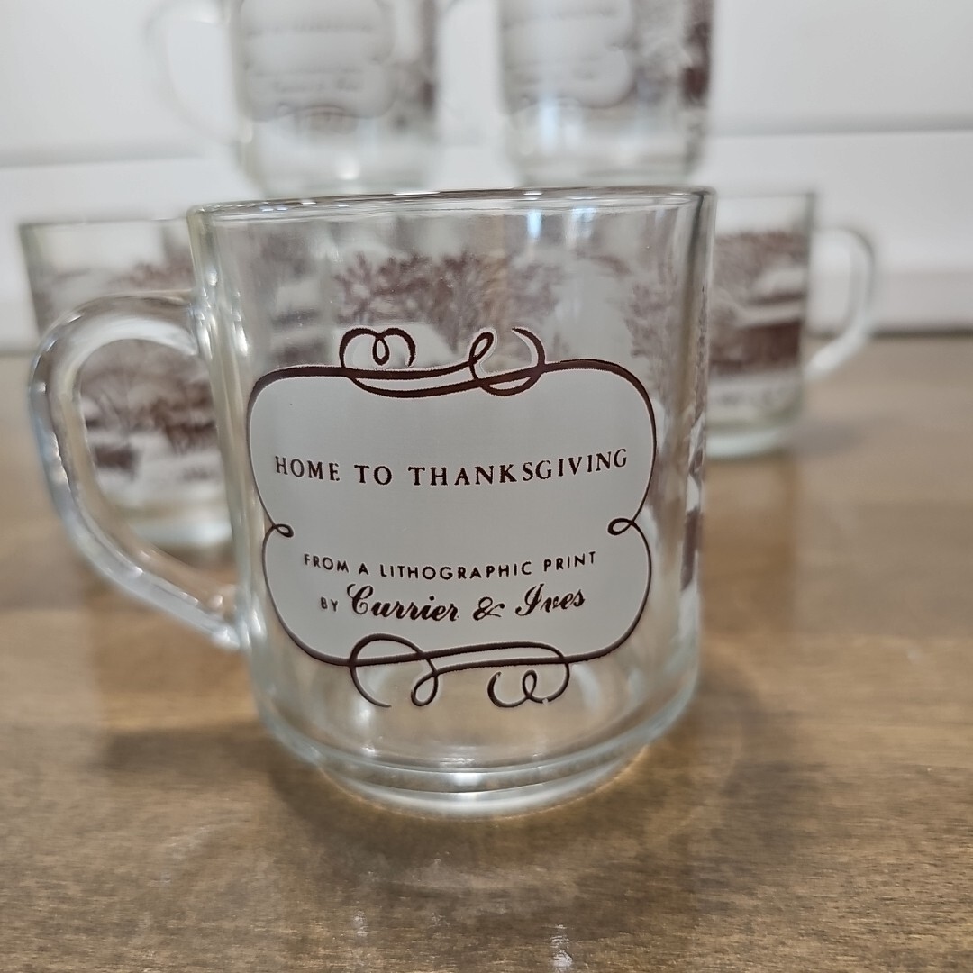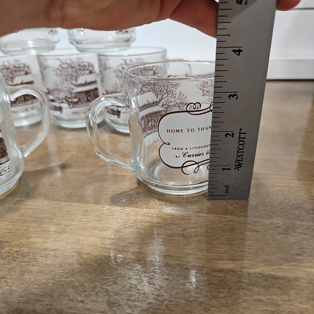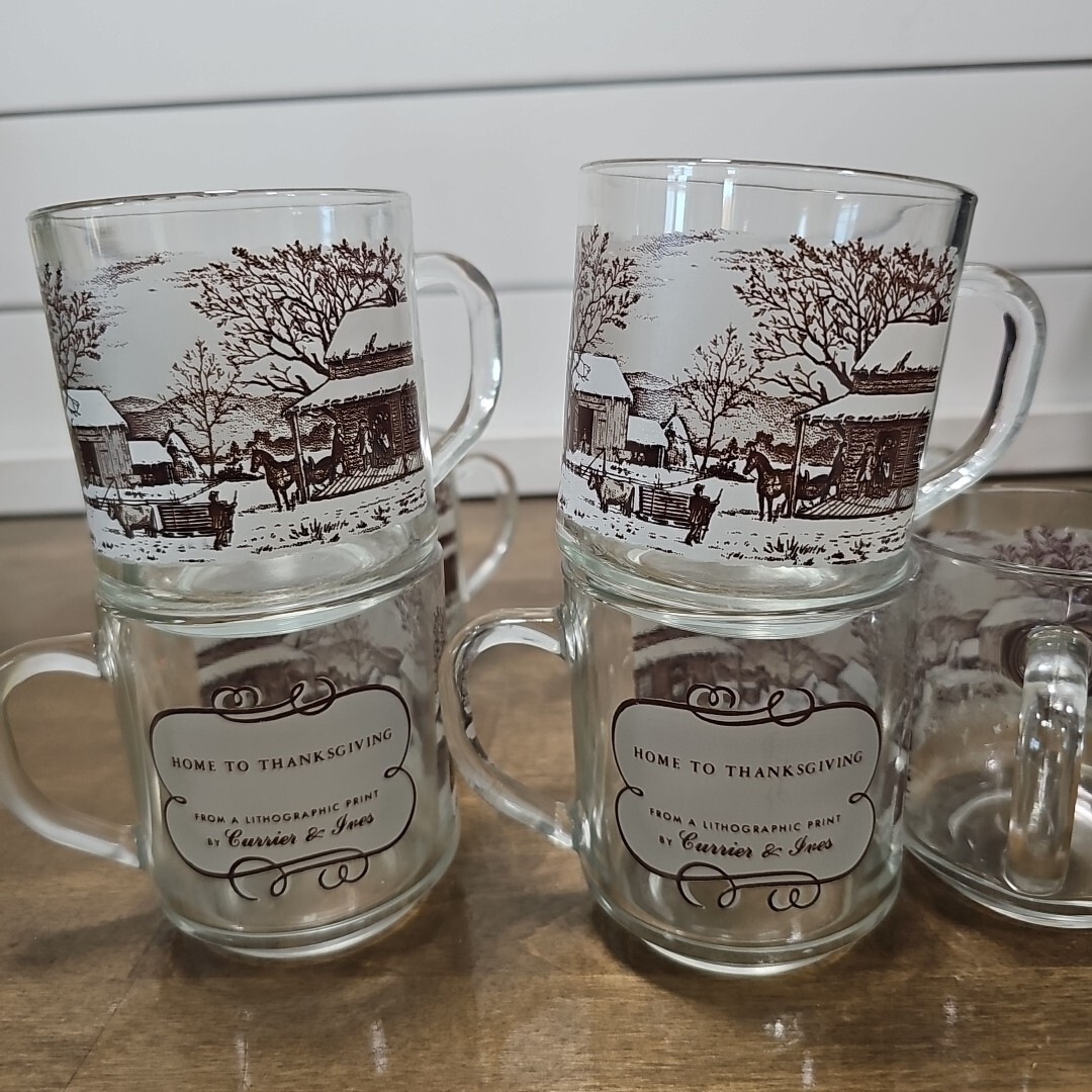 Vintage Set of 8 Currier & Ives Winter Homestead Luminarc Glass Handled Mugs