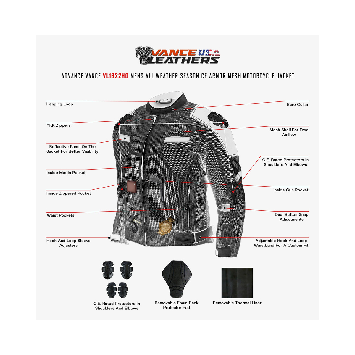 Mesh shell for free airflow Removable thermal liner C.E. rated protectors in shoulders and elbows Removable back protector pad with pocket for optional C.E. protector 2 waist level pocket and 1 chest pocket 1 gun pocket and a zippered pocket inside the jacket Pocket for audio devise/ accessories on thermal liner Zippered sleeve adjusters Adjustable hook and loop waistband for a custom fit Reflective panel on the jacket for better visibility 1 gun pocket and a zippered pocket inside the jacket Dual button snap adjustments on both arms for a secure fit with armor