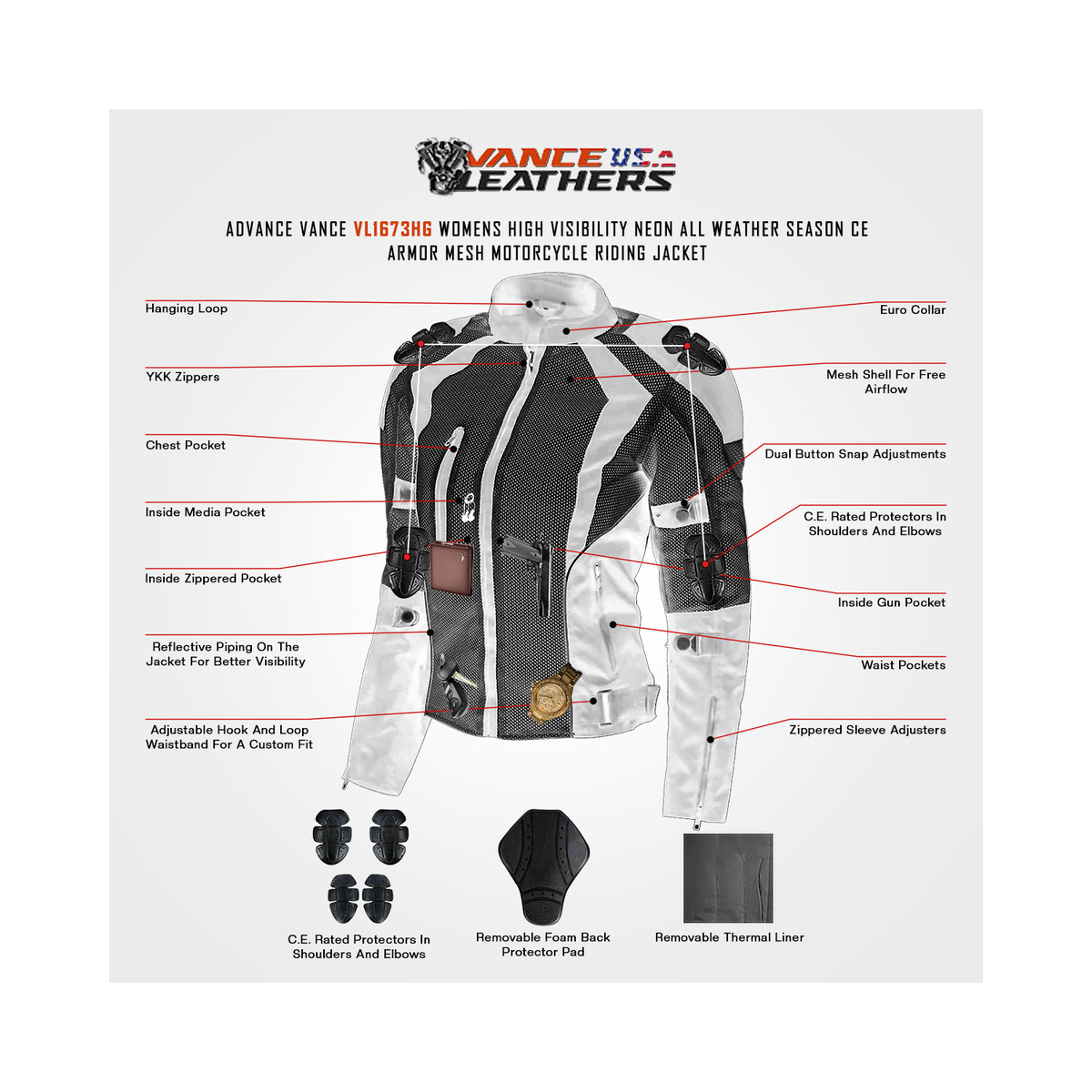 The Vance Women s High Visibility Mesh Motorcycle Riding Jacket with CE Armor Removable Thermal Liner is a thoughtfully designed garment catering to the specific needs of female riders. Crafted with a high-visibility mesh fabric, this jacket not only offers optimal airflow for comfort during warm rides but also enhances visibility on the road, promoting safety. The incorporation of CE armor in key impact areas ensures a high level of protection, meeting safety standards for motorcycle gear. The added versatility of a removable thermal liner allows for adaptability to varying weather conditions, ensuring warmth on colder days without compromising breathability. Combining style, safety, and functionality, the Vance Women s High Visibility Mesh Motorcycle Riding Jacket is a reliable choice for female riders seeking a well-rounded and protective solution for their riding adventures.