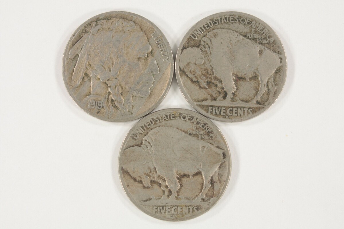 Lot of 3 Buffalo Nickels (1919-P + D + S) in VG to VF Condition, Natural Color