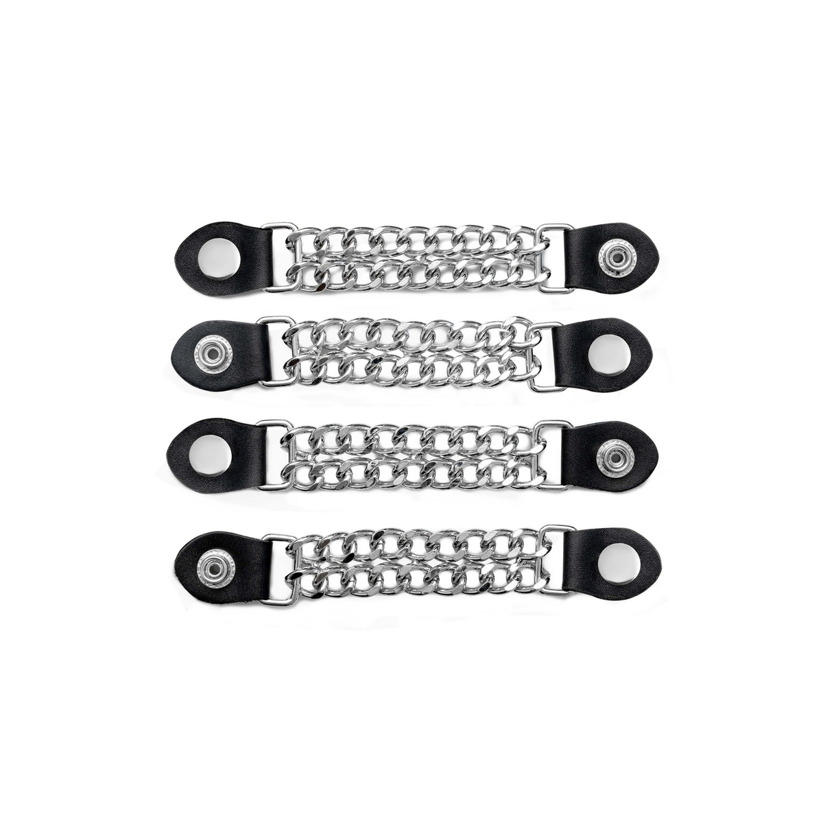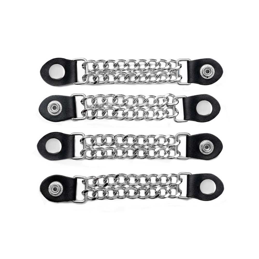 Inject an element of comfort and style into your road gear. These vest extenders showcase unique designs while you get a bit more breathing room out of your garment. Includes: 4pc faux leather and chrome chain extender with Plain Snaps. Measures 6-1/2 x 1 . Not sold individually.