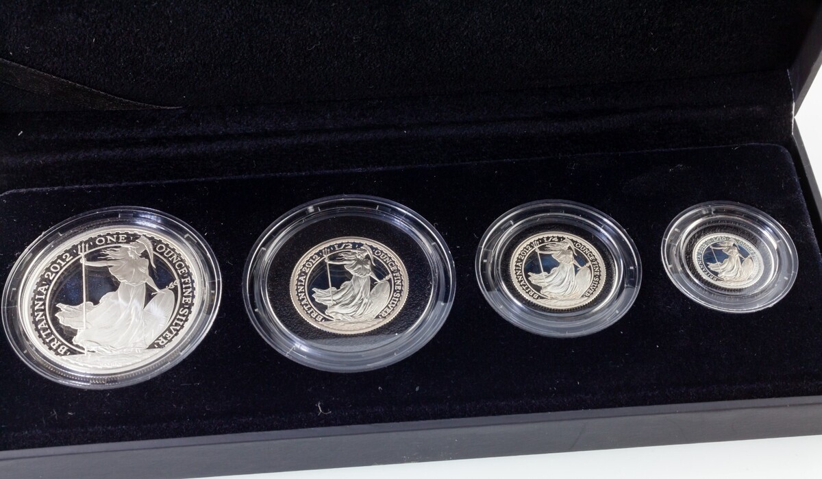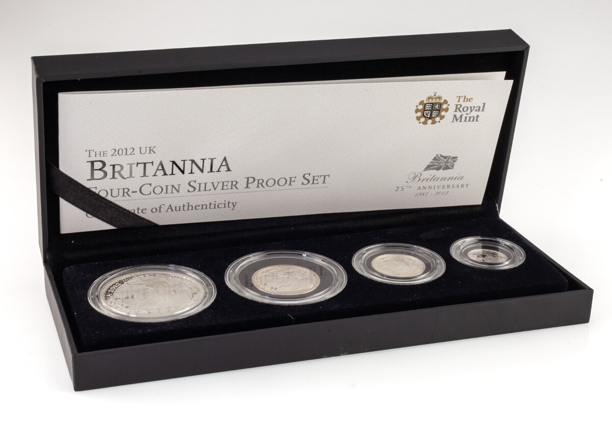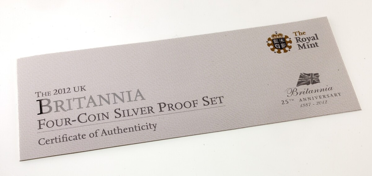 2012 Vereinigtes Konigreich Royal Mint Vier-Münzen-Silber-Britannia-Proof-Set mit Box und Echtheitszertifikat