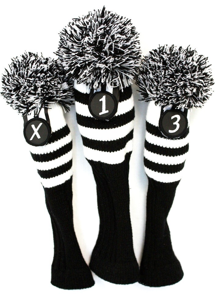 Black White Pom Pom Sock Vintage Knit Headcover 3 Piece Set Head covers protect your golf club headcover
