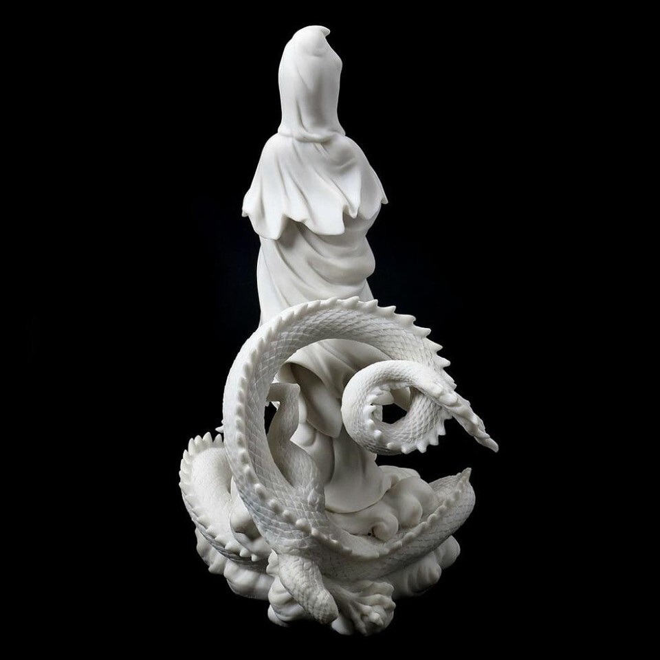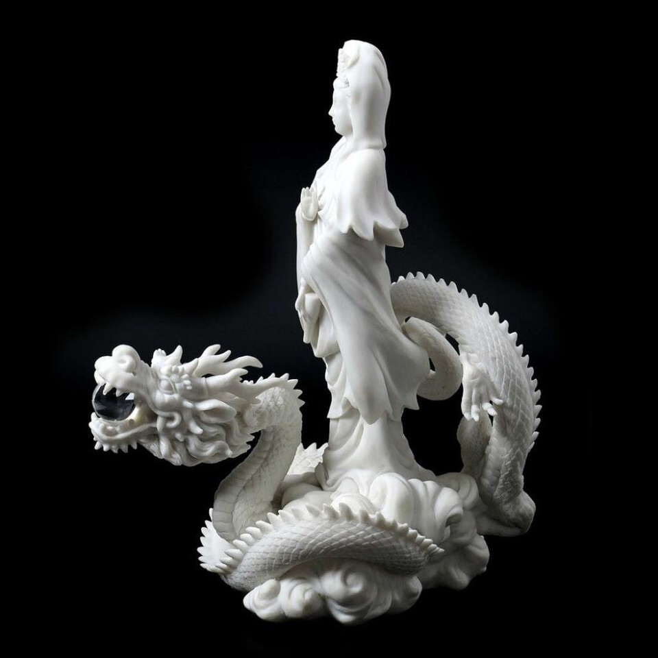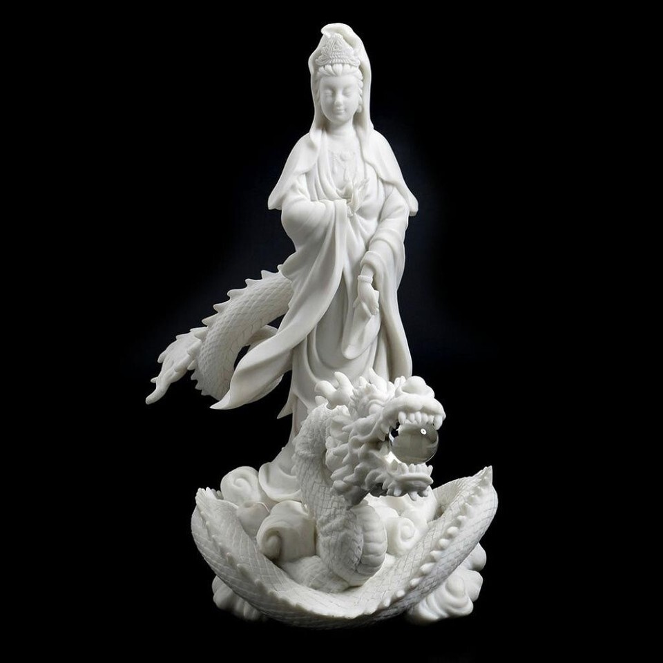 KWAN YIN ON DRAGON STATUE 12.5" Quan Yin Guan Buddha Goddess White Marble Resin
