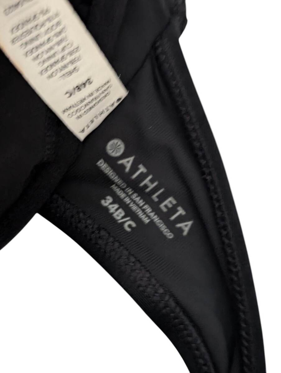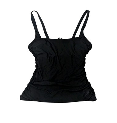 This is a beautiful woman's athleta tankini top. Size 34b/c. Adjustable nice wide straps. Ruched at the side for a very figure flattering fit. Double lined. Black. Underwire bra. This swimsuit is super cute and very figure. Flattering! The sizing is just 34b/c. I would say the body though fits like a size small