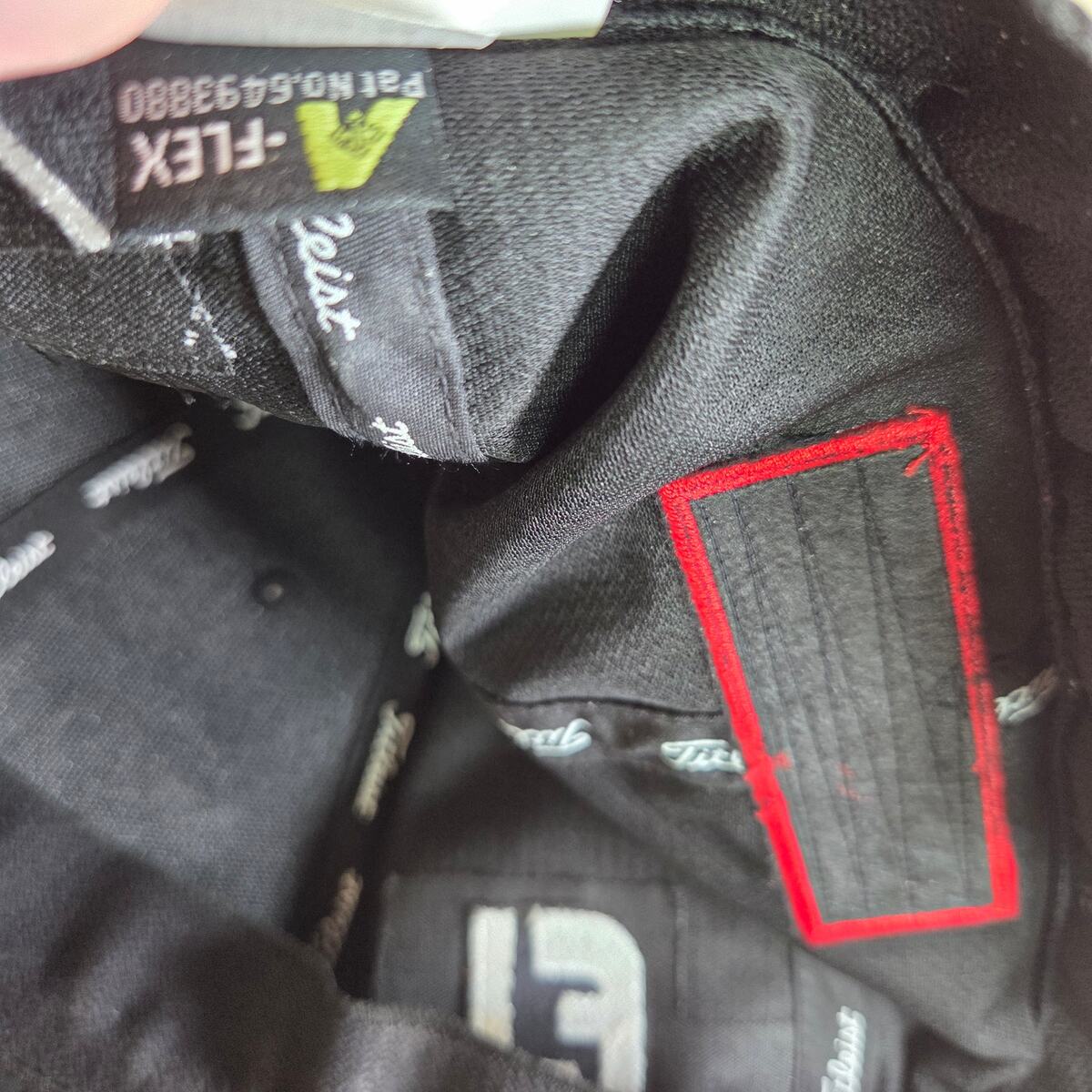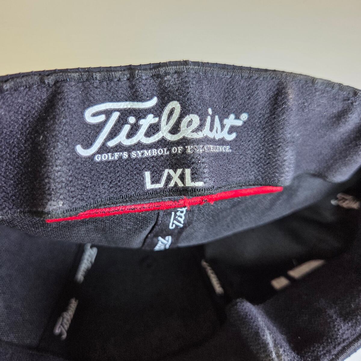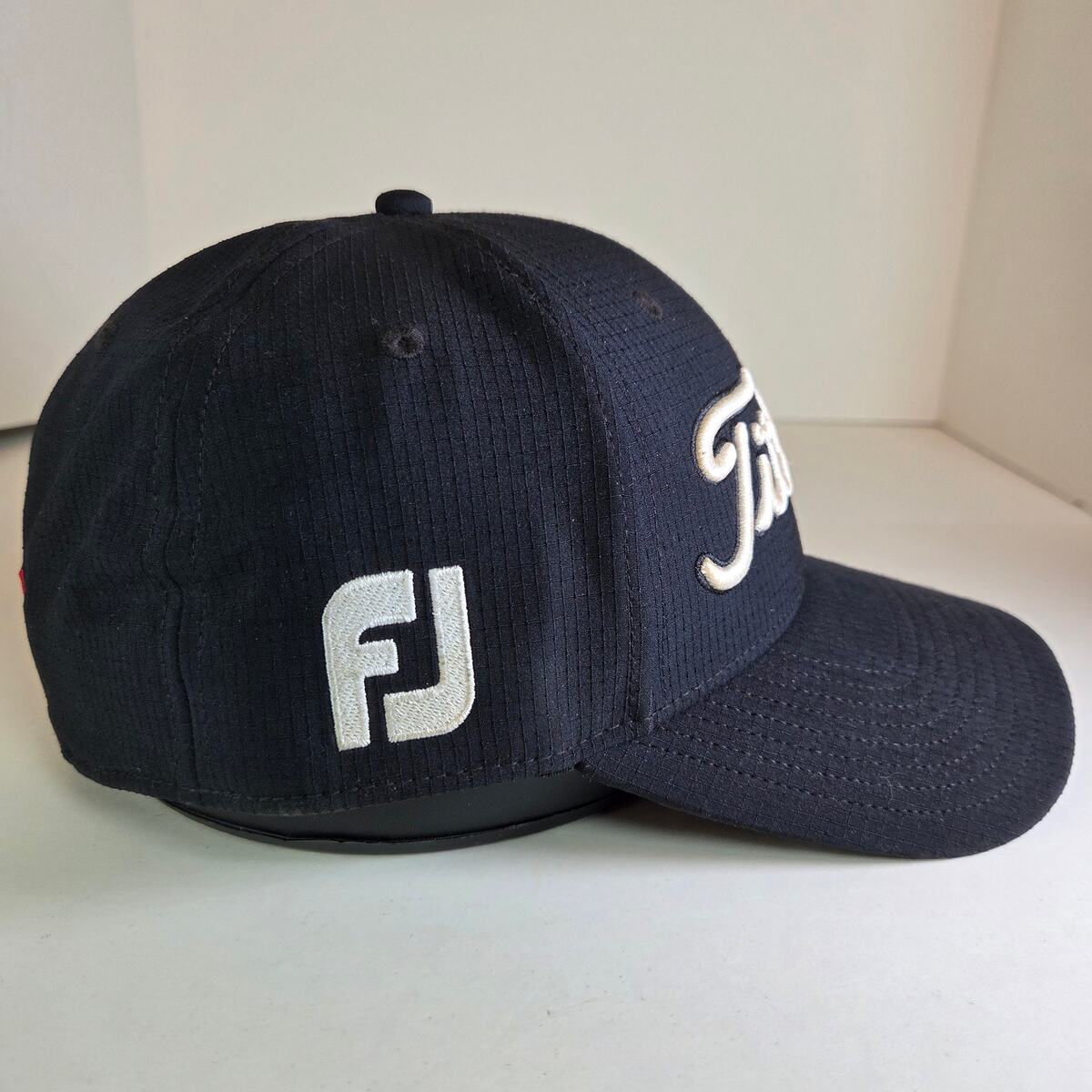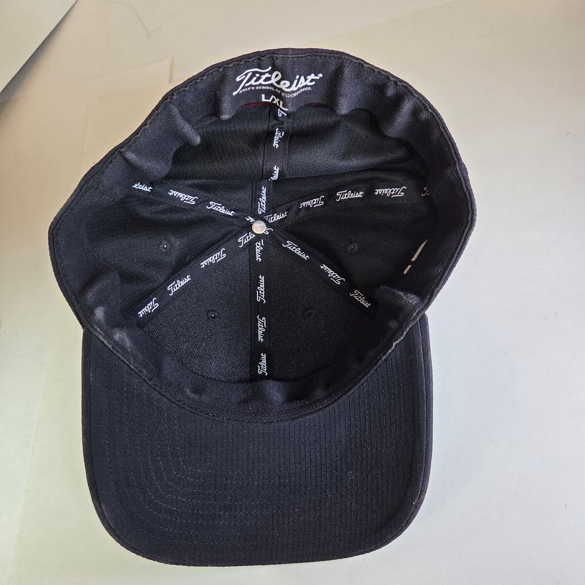 Clean, modern Titleist Pro V1 A-Flex fitted golf hat in black, size L/XL. Lightweight, grid-texture performance fabric with stretch fit. Embroidered Titleist script front, FJ logo on one side and PRO V1 on the other; Titleist patch at back. Very good pre-owned condition?no rips/holes; light wear on the inner band only.