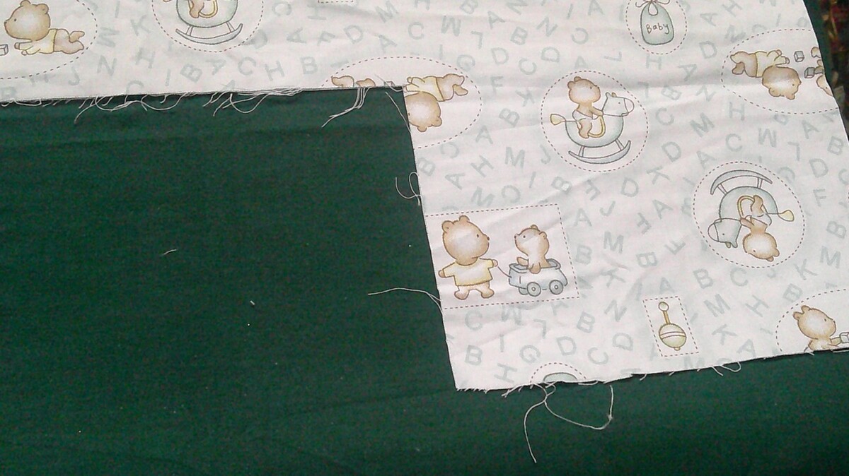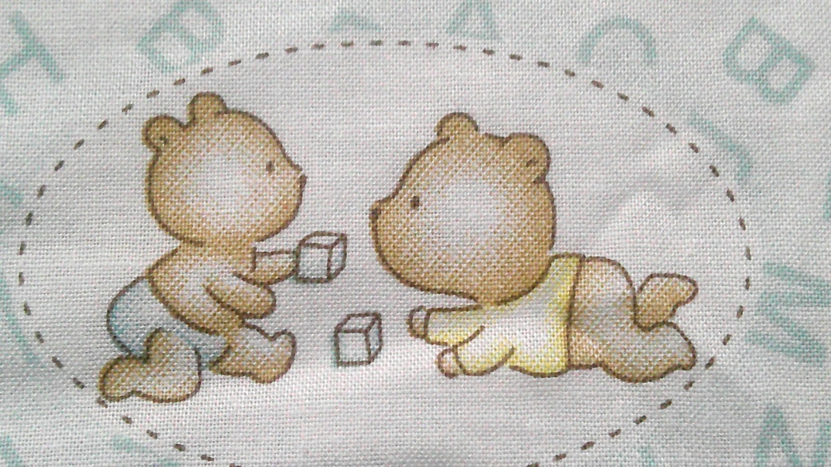 This fabric listing is a juvenile print featuring brown teddy bears playing blocks and riding a rocking horse among other things in pastel colors of light blue and yellow. The background is white with light blue letters scattered about. This is 42" x 4-1/2" with another attached piece of 14" x 5".